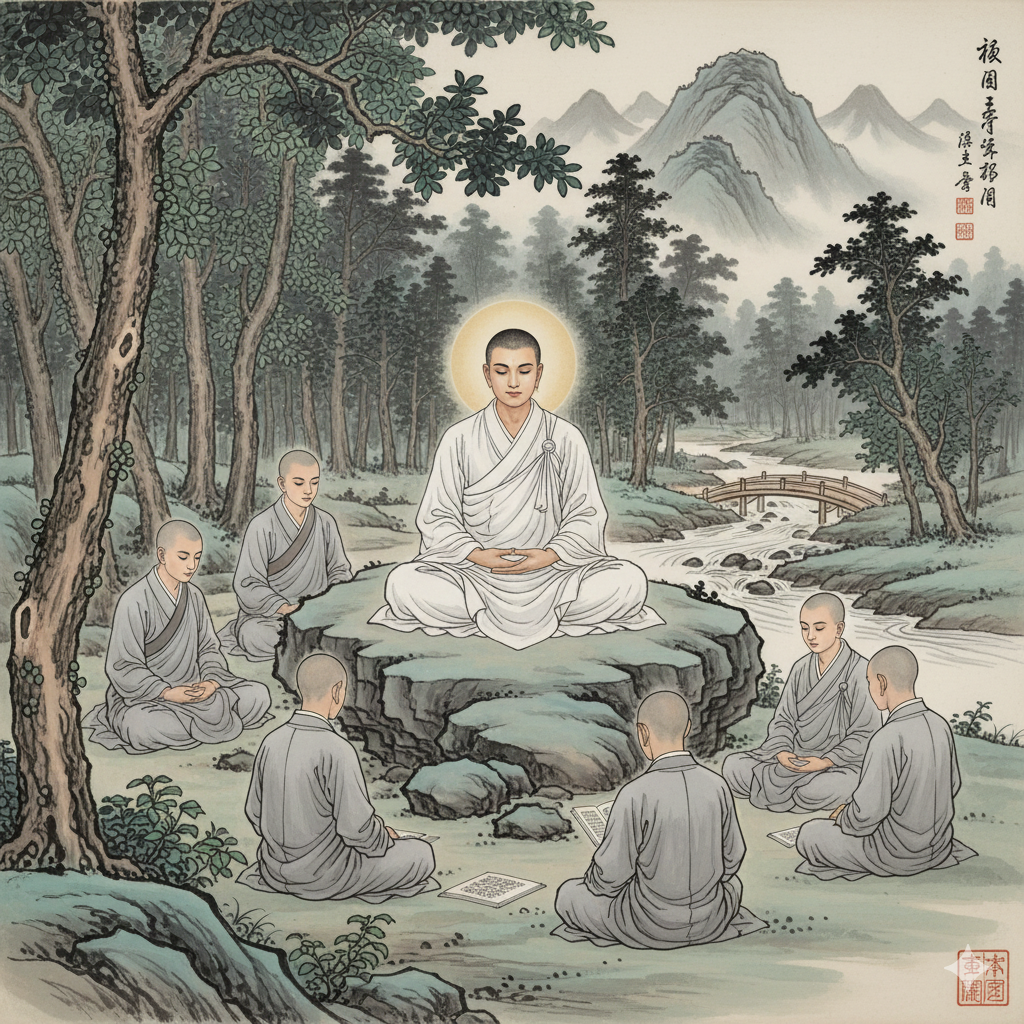 - 한글: 바라나시 근처 외딴 산속의 평화로운 수행터를 동양화풍으로 그려주세요. 중앙에는 깨끗하고 단정한 흰색 도포를 입은 젊은 선인(젊은 석가모니)이 고요히 좌선하고 있습니다. 그의 주변에는 단정한 회색 승복을 입은 젊은 출가자들이 진지한 표정으로 명상하거나 경전을 읽고 있습니다. 배경으로는 울창한 나무와 잔잔한 개울, 멀리 보이는 산봉우리가 평온하고 영적인 분위기를 더합니다. 전체적으로 안정적이고 지혜로운 가르침의 현장을 보여줍니다. 모든 인물들은 단정한 옷을 입고 있습니다. (200자)