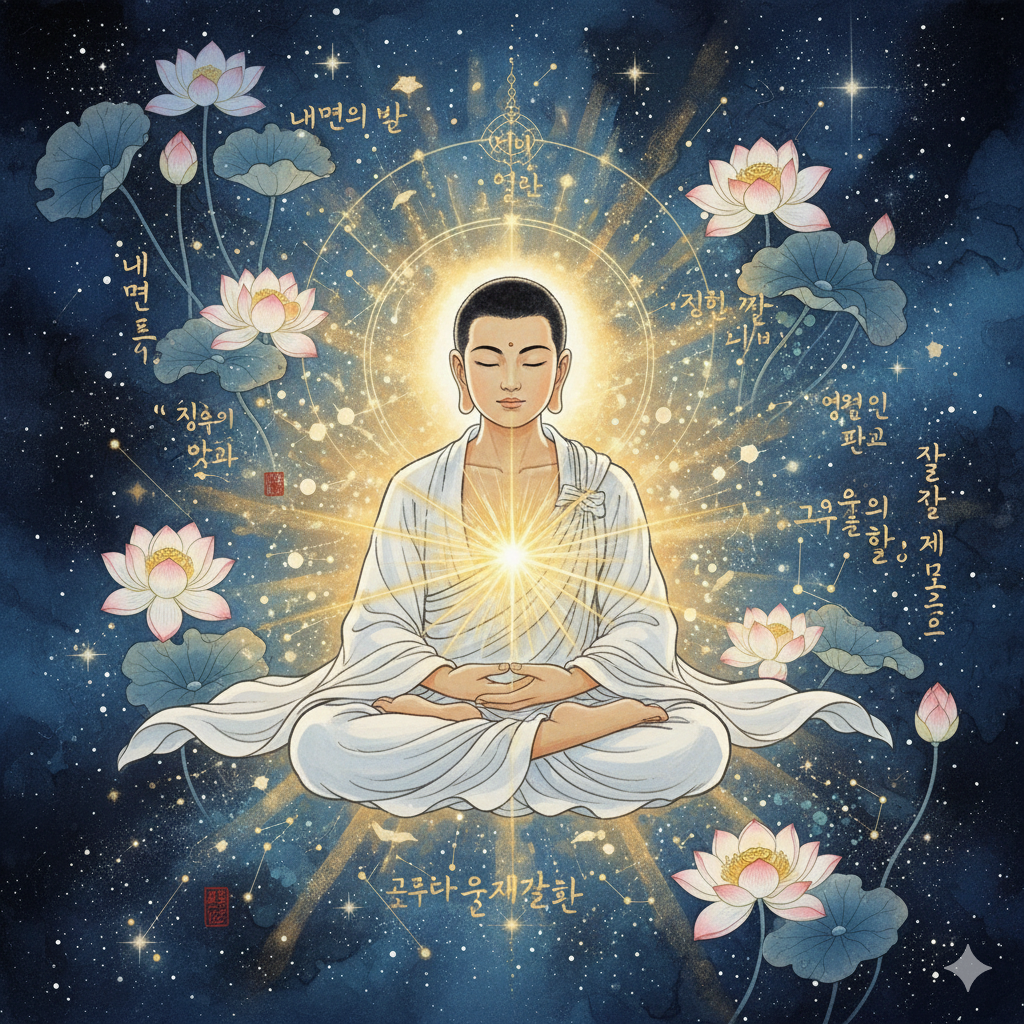 - 이미지 생성 정보: 한글: 고요하고 영적인 동양화풍의 우주 공간을 배경으로, 단정한 도포를 입은 선인(젊은 석가모니)이 눈을 감고 깊은 명상에 잠겨 있습니다. 그의 내면에서 밝은 황금빛 에너지가 뿜어져 나와 거대한 우주 공간을 가득 채우고 있습니다. 우주 속에는 빛나는 연꽃과 별들이 떠다니며 지혜와 평화의 상징을 이루고, 그 주위로 이 시의 아름다운 구절들이 은은하게 빛나는 글자로 새겨져 있습니다. 선인의 옷은 단정하고 흐르는 듯한 형태로 표현됩니다. (200자)