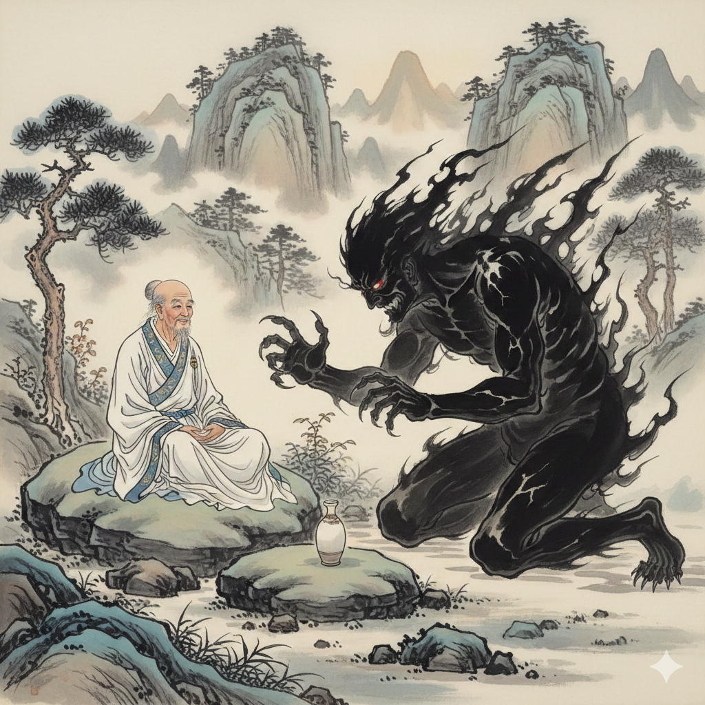 - English Prompt: An East Asian style painting in Google Nano Banana style showing a serene mountain retreat shrouded in darkness and chaos. On one side, the ascetic (in neat white robes) sits calmly in meditation. In front of him, the colossal and grotesque demon Papius (a demonic form radiating red and black energy) appears, threatening the ascetic with a furious expression. The scene is dynamic, with trees swaying and lightning-like energy spreading due to the demon's appearance. The ascetic's tranquility sharply contrasts with the demon's intense rage. Both the demon and the ascetic wear neat attire. (110 words)