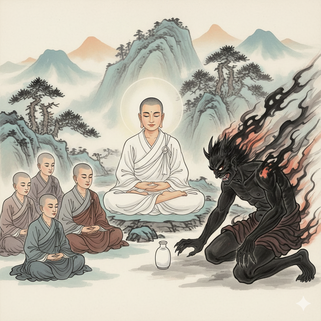 - 이미지 생성 정보: 한글: 동양화풍의 산수 배경을 바탕으로, 고요한 산중 수행터에 단정한 흰 도포를 입은 선인이 평온하게 좌선하고 있습니다. 그의 주변에는 단정한 회색 승복의 제자들이 경청하는 모습이 평화롭습니다. 그러나 그 뒤편, 혹은 멀리 산기슭에는 어둠 속에서 거대한 그림자로 형상화된 마신 파피어스(마라, 위협적인 복장)가 붉은 기운을 뿜으며 이들을 노려보는 장면을 콜라주 스타일로 배치합니다. 평화와 위협이 공존하는 분위기입니다. 모든 인물은 단정한 옷을 입고 있습니다. (198자)