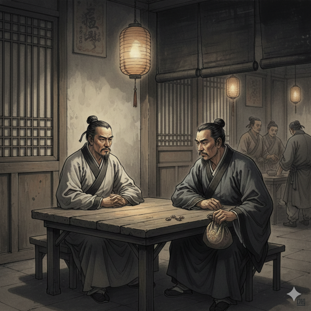 이미지 생성 정보 (한국어 프롬프트): 어두운 객잔의 구석 테이블에 단정하게 앉아있는 히도케이가 보석상인 복장을 한 야차귀에게 진지한 표정으로 질문을 던지고 있습니다. 야차귀는 망설이는 듯 시선을 피하다가, 결국 모든 것을 털어놓는 듯한 모습입니다. 낡고 짙은 색감의 동양화풍 배경은 비밀스러운 분위기를 더하며 두 인물 사이의 깊은 대화와 갈등을 표현합니다.