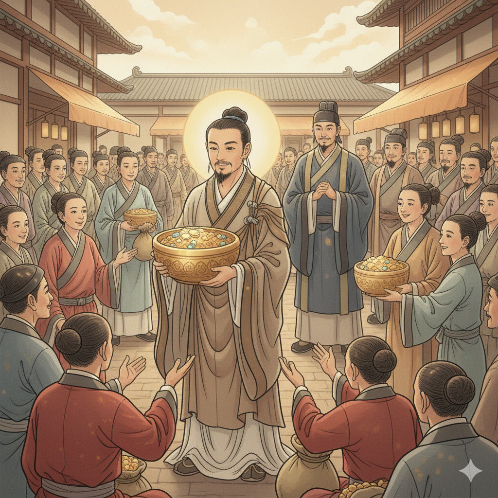 이미지 생성 정보 (한국어 프롬프트): 평화로운 바라나시국의 시장 광장, 단정한 전통 의상을 입은 히도케이가 환한 미소를 지으며 백성들에게 용왕에게 받은 진귀한 보물(금은보화)을 나누어주고 있습니다. 백성들은 기쁨과 감사로 가득한 표정으로 보물을 받고 있으며, 국왕이 멀리서 흐뭇하게 이 장면을 지켜봅니다. 따뜻하고 활기찬 동양화풍의 나눔의 장면을 묘사합니다.