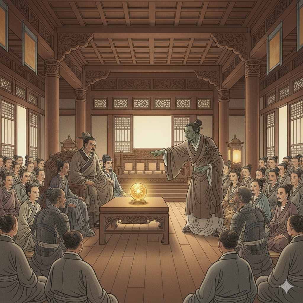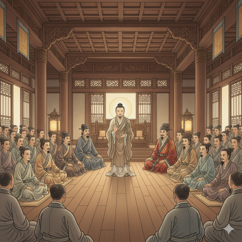 이미지 생성 정보 (한국어 프롬프트): 단정한 전통 의상을 입은 바라나시국의 지혜로운 현자 히도케이가 고대 동양풍 궁궐 내 넓은 홀에서 온화한 미소를 지으며 왕과 신하, 백성들에게 설법하고 있습니다. 왕과 신하들은 경건한 자세로 그를 우러러보고 있으며, 주변에는 깨끗한 복장의 백성들이 평화롭게 앉아 현자의 지혜를 경청하고 있습니다. 배경은 웅장하고 섬세한 동양 건축물입니다.