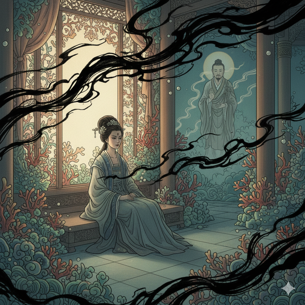 이미지 생성 정보 (한국어 프롬프트): 화려하고 신비로운 용궁 내부, 단정하게 차려입은 메이소 용왕 부인이 어두운 표정으로 창밖을 응시하고 있습니다. 그녀의 눈빛에서는 강렬한 질투와 분노가 엿보이며, 마음속 어두운 욕망이 검은 연기처럼 피어오르는 듯한 시각적 은유를 동양화풍으로 표현합니다. 뒤편으로는 용왕이 히도케이를 만나는 장면이 희미하게 투영되어 질투의 원인을 암시합니다.