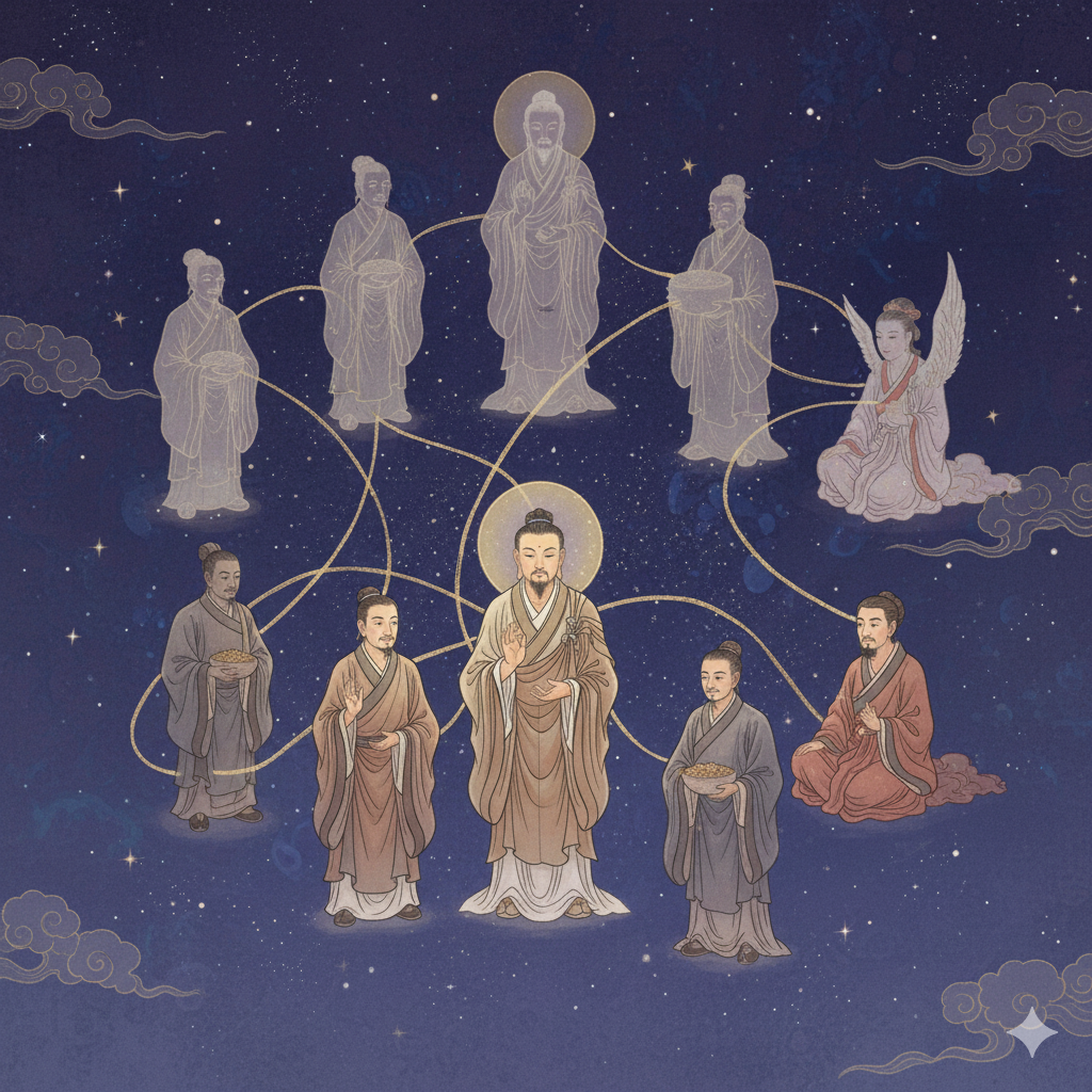 Image Generation Prompt (English Prompt): In a tranquil and mysterious Eastern-style cosmic space, the transparent silhouettes of past figures (Hidokei, the King of Varanasi, Yaksha, the Dragon King's wife) float. Below them, the current forms of Shakyamuni Buddha, Sariputta, Moggallana, and the wife of King Bimbisara's chief minister are visibly connected. This spiritual collage metaphorically illustrates the cycle of reincarnation and karmic connections.