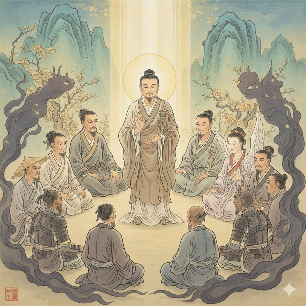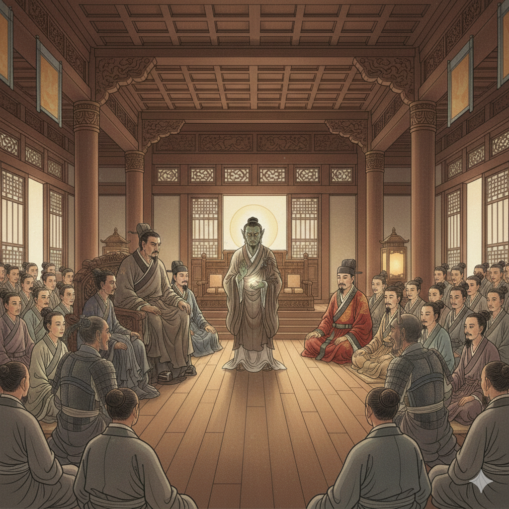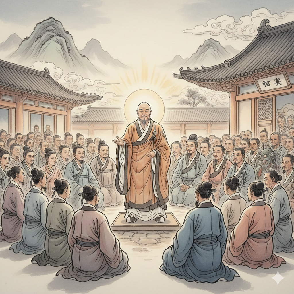 고요하고 영적인 분위기의 동양 사원 마당, 단정한 전통 의상을 입은 지혜로운 현자(히도케이)가 가운데 서서 자애로운 미소로 수많은 사람들을 향해 설법을 하고 있다. 그의 주변에는 왕, 귀족, 평민, 그리고 용왕과 야차귀 등 다양한 계층과 종족의 사람들이 각자의 고뇌를 안고 경건한 표정으로 경청하고 있다. 밝고 따뜻한 빛이 그들을 감싸며, 질투와 탐욕의 어두운 기운이 지혜와 깨달음의 빛으로 서서히 정화되는 모습을 은유적으로 표현한다. 배경에는 평화로운 산과 흐르는 구름이 동양화풍으로 섬세하게 그려져 있다.