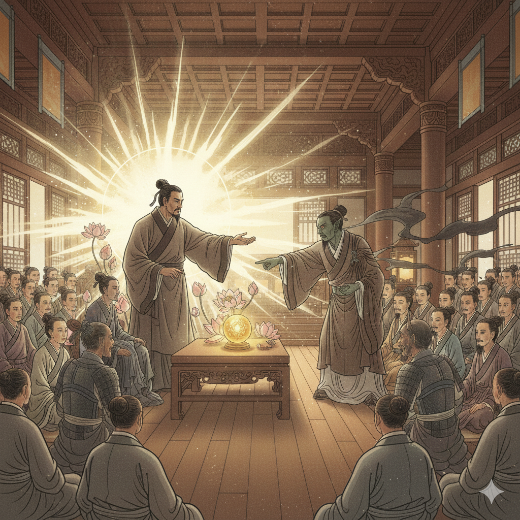 이미지 생성 정보 (한국어 프롬프트): 단정한 전통 복장을 한 히도케이가 야차귀를 향해 손을 뻗어 설득하는 강렬한 장면입니다. 그의 뒤편으로 연꽃이 피어나며 깨달음의 빛이 뿜어져 나오고, 야차귀는 히도케이의 말에 충격과 깨달음을 동시에 느끼는 듯한 복합적인 표정을 짓고 있습니다. 지혜가 악업을 이기는 순간을 동양화풍으로 신비롭게 표현합니다.