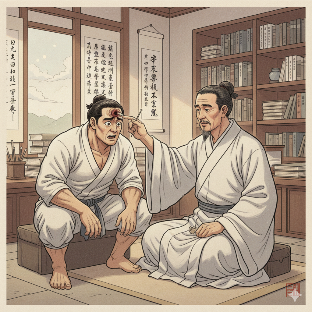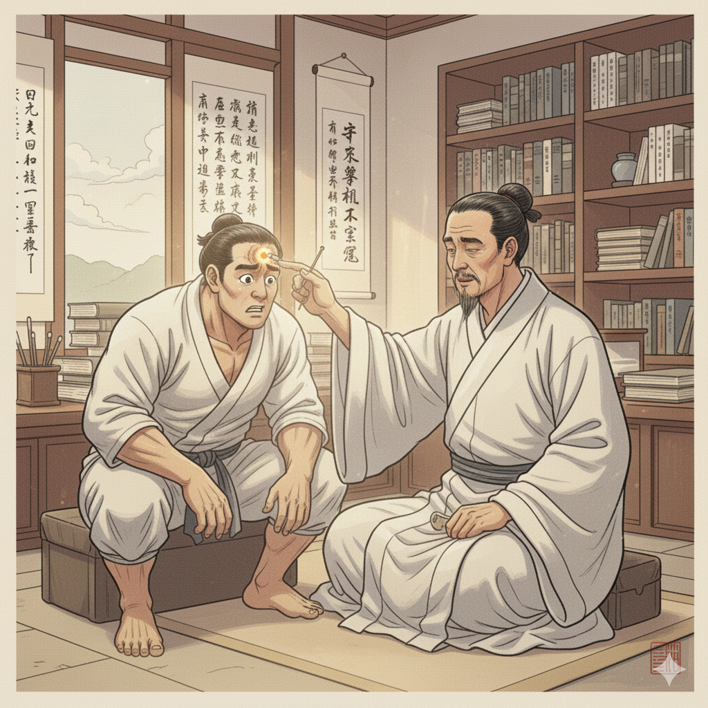 - English: In a serene, tidy Eastern study, a neatly dressed physician (or therapist) calmly, yet deeply, examines the forehead of the great hero (modern individual). Startled by the physician's sharp question, the hero's eyes redden with complex emotions (surprise, hope, doubt). The physician's gesture emanates wisdom. (279 characters)