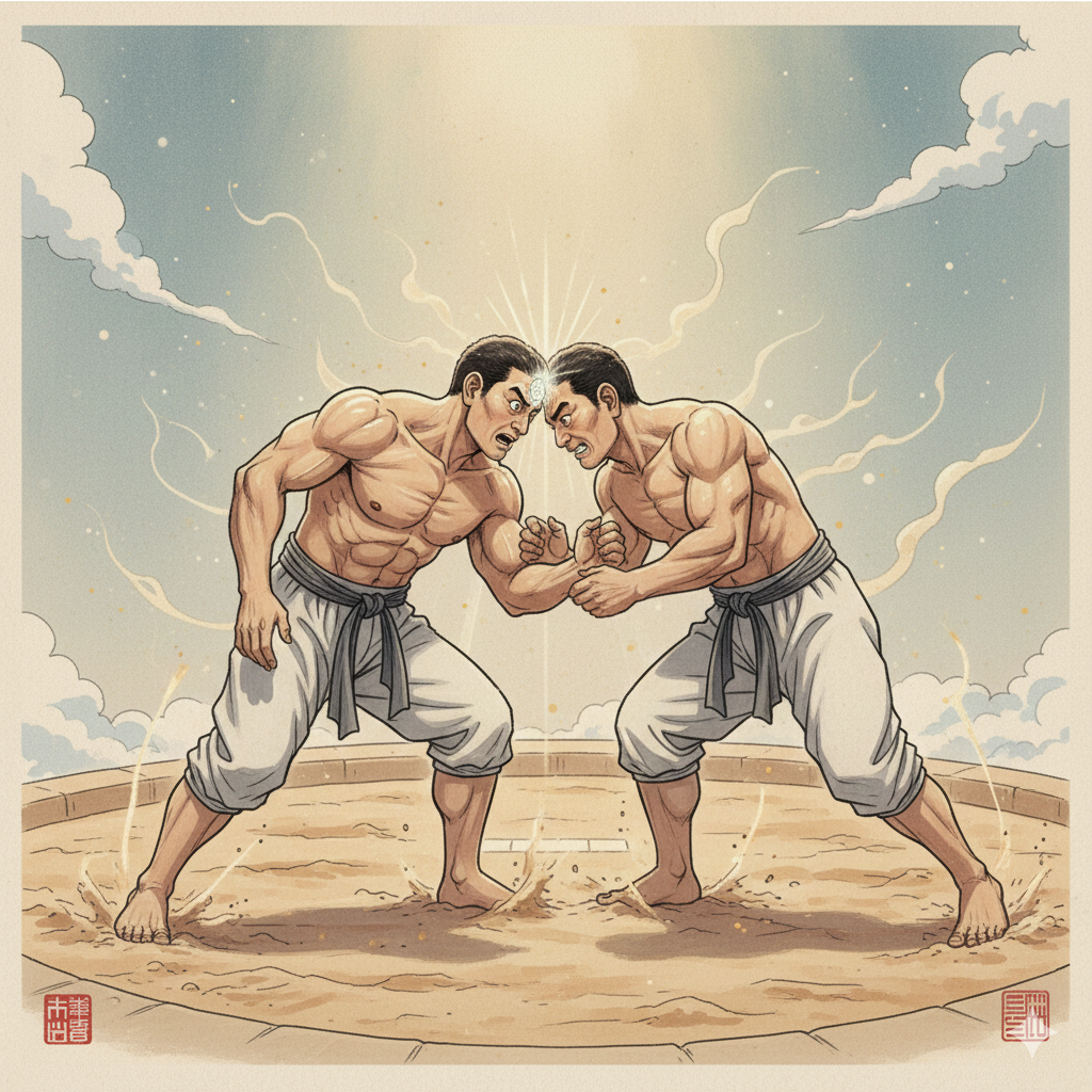 - 한글: 빛나는 금강주가 이마에 박힌 단정한 옷차림의 용맹한 대장사가 씨름 경기장에서 다른 장사와 팽팽하게 맞서고 있습니다. 박치기 순간, 금강주가 이마 속으로 사라지면서 고통보다는 놀라움이 가득한 표정을 짓고 있습니다. 역동적이면서도 신비로운 분위기를 동양화풍으로 표현합니다. (215자)