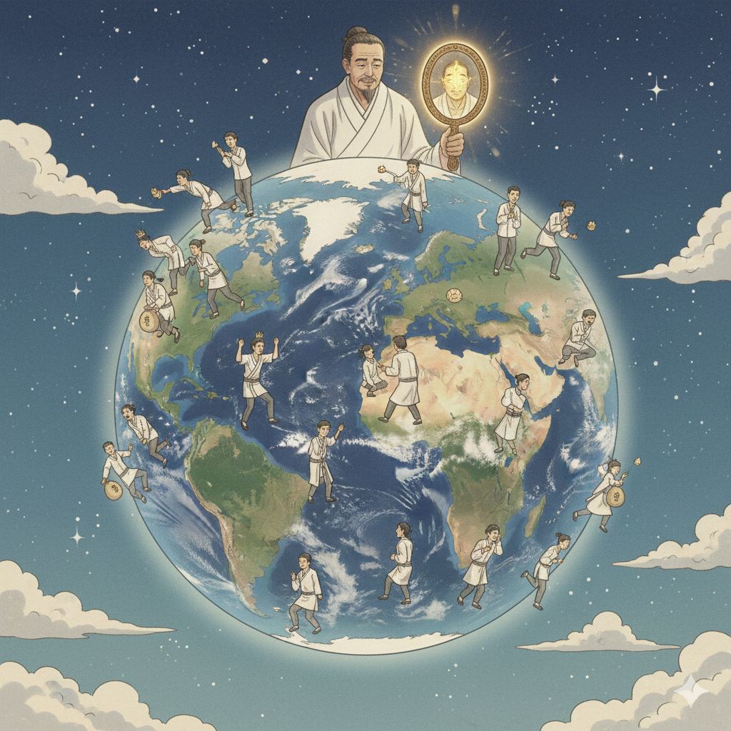 - 한글: 고요하고 영적인 우주 공간에 떠 있는 거대한 지구본이 보입니다. 지구본 위로는 단정하게 옷을 입은 수많은 사람의 실루엣들이 각자의 탐욕, 분노, 어리석음에 사로잡혀 헤매는 모습과, 이마에서 밝은 빛을 내뿜는 '불성'의 상징적 이미지가 콜라주처럼 대비됩니다. 인자한 부처님(명의)이 이를 지켜보고 있으며, 전체적으로 사색적이고 교훈적인 동양화풍입니다. (270자)