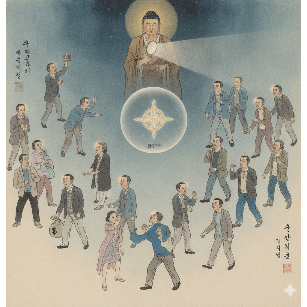 한글 이미지 정보: 고요하고 영적인 동양화풍 우주 공간에, 반짝이는 '금강주'가 투명한 구슬 형태로 떠 있습니다. 그 주위를 단정하게 옷을 입은 평범한 사람들이 각자의 탐욕(돈, 권력), 성냄(화를 내는 모습), 어리석음(방황하는 모습)에 사로잡혀 무심히 지나치고 있습니다. 그들 중 일부는 이마에서 은은한 빛이 새어 나오고 있지만, 스스로는 인지하지 못하는 모습입니다. 멀리서는 인자한 표정의 부처님(명의)이 이 모든 것을 조용히 지켜보고 계시며, 한 손에는 빛을 반사하는 거울을 들고 있습니다. 전체적으로 인간의 내면 탐구와 깨달음의 순간을 함축적으로 표현합니다. (288자)