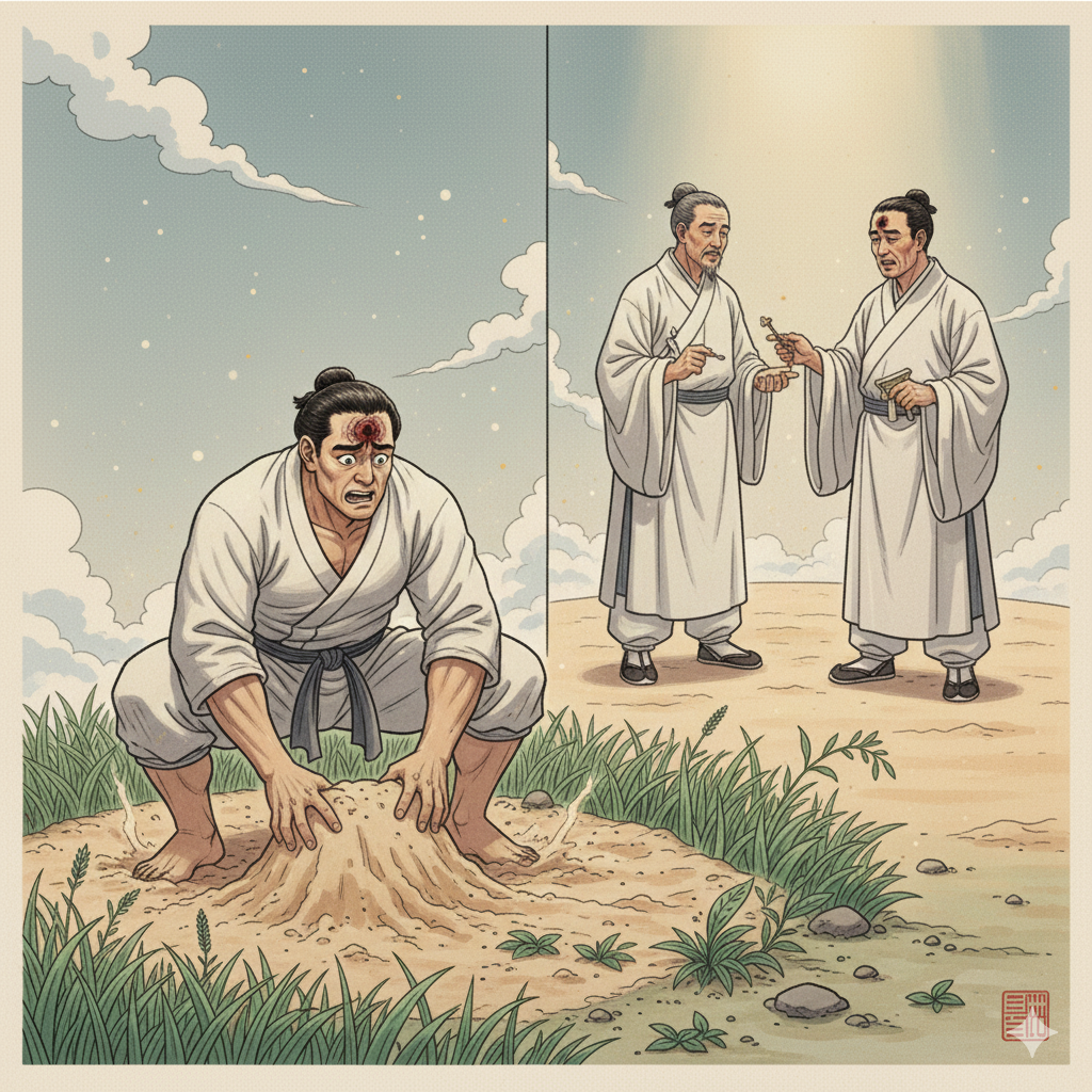 - 명의는 상처를 들여다보고 금강주가 살 속에 들어간 것이 원인임을 알아차렸다. “이마 위에 있던 금강주는 어디로 갔습니까?” 갑자기 나온 질문에 대장사는 어리둥절해졌다. “이마 위의 금강주라니요? 어떻게 그것을 아십니까? 아니, 혹시 지금도 내 이마 근처에 금강주가 있다는 말씀이십니까? 정말 어디 있는지 알고 계신가요?” 그는 소중하게 여기던 금강주 생각에 갑자기 눈시울이 붉어졌다. 명의는 대장사의 이마 상처를 깊이 들여다보자마자, 그 고통의 근원이 바로 '살 속에 들어간 금강주'라는 사실을 직관적으로 알아차렸습니다. “당신의 이마 위에 있던 금강주는 어디로 갔습니까?” 이 예상치 못한 질문에 대장사는 혼란스러워했지만, 동시에 잊고 있던 보물의 존재에 대한 희미한 기대감으로 눈시울이 붉어졌습니다. 명의는 그에게 '당신의 소중한 것은 당신 밖에 있지 않다'는 심오한 진실을 일깨우고 있었습니다.
