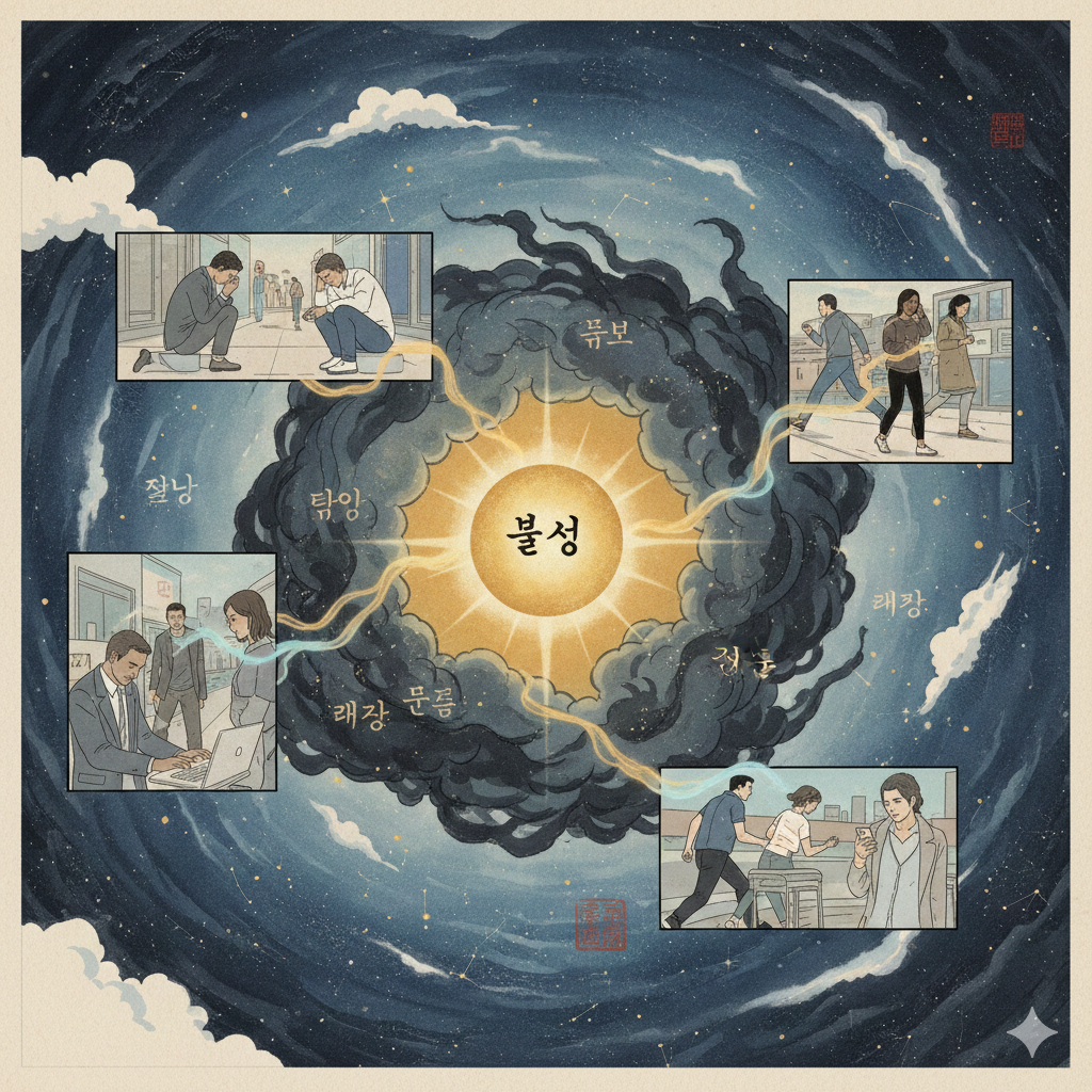 한글 프롬프트: 고요한 동양화풍의 우주 공간을 배경으로, 밝게 빛나는 '불성'의 황금빛 구슬이 중심에 떠 있습니다. 그 구슬 주변에는 욕심(탐욕), 성냄(분노), 어리석음(무지)을 상징하는 검고 혼탁한 기운이 휘감고 있습니다. 이 기운들 너머로, 단정하고 현대적인 옷을 입은 다양한 인종과 연령대의 사람들이 고뇌하거나 바쁘게 살아가는 모습들이 콜라주처럼 배치되어 있습니다. 이들은 각자의 삶에 몰두하느라 빛나는 불성을 보지 못하고 있지만, 일부 인물들 사이로는 희미하게 깨달음의 빛이 스며들고 있습니다. 전체적으로 사색적이고 영적인 분위기를 강조하며, 인간의 내면 탐구를 담고 있습니다.