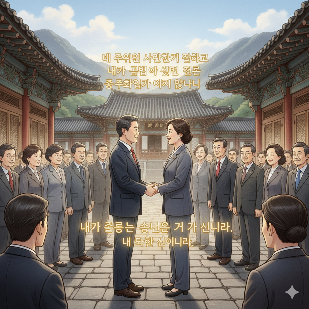이미지 생성 정보: 한글: 고요한 동양화풍의 산사 마당. 단정하게 옷을 입은 중년 남녀가 서로 마주보며 온화한 미소를 짓고 손을 맞잡고 있다. 그들 사이에서는 '네 주위의 사람한테 잘하고 내가 고집이 안 세면 절대로 주화입마가 오지 않나니', '내가 소통하는 상대는 그 자가 신이니라. 내 또한 신이니라.'라는 글귀가 황금빛으로 떠오르고, 그 빛이 주변의 다른 사람들에게도 퍼져나가 모두의 얼굴이 밝게 빛난다. 구글 나노 바나나 스타일.