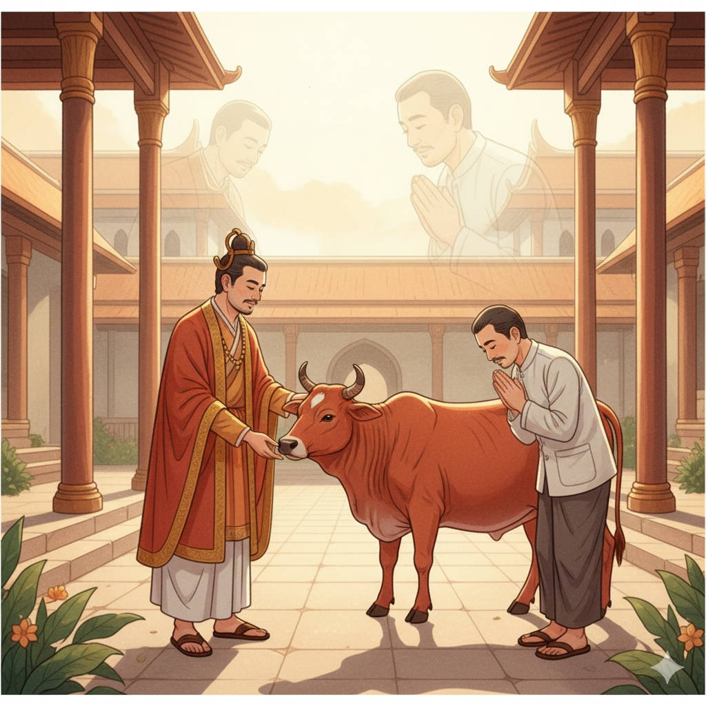 English Image Information (approx. 300 characters): Under the warm palace sun, King Brahmadatta, royally robed, kindly bestows a red cow and calf upon the neatly dressed Brahmin scholar. The Brahmin bows deeply in gratitude, as faint silhouettes of a serene Ananda and King Pasenadi appear behind him, hinting at their past lives. A Nanobanana-style Eastern painting captures this moment of compassion and karmic connection with warm, emotive tones.