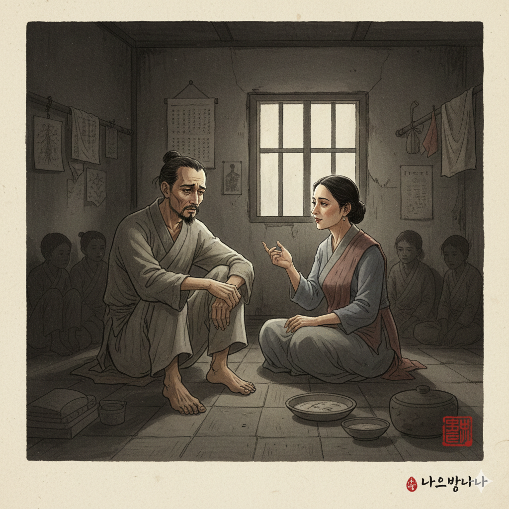 한국어 이미지 정보 (300자 내외): 초라하고 허름한 집 내부, 앙상하게 마른 단정한 옷차림의 바라문 선비가 절망적인 표정으로 바닥에 앉아있다. 그의 아내는 침착하고 지혜로운 눈빛으로 왕을 만날 방법을 귀띔한다. 주변에는 굶주린 아이들의 어두운 실루엣이 희미하게 보여 비극적 상황을 강조한다. 나노바나나 스타일로 절박함 속에서 피어나는 한 가닥 희망을, 동양화풍의 감성적인 분위기로 표현한다.