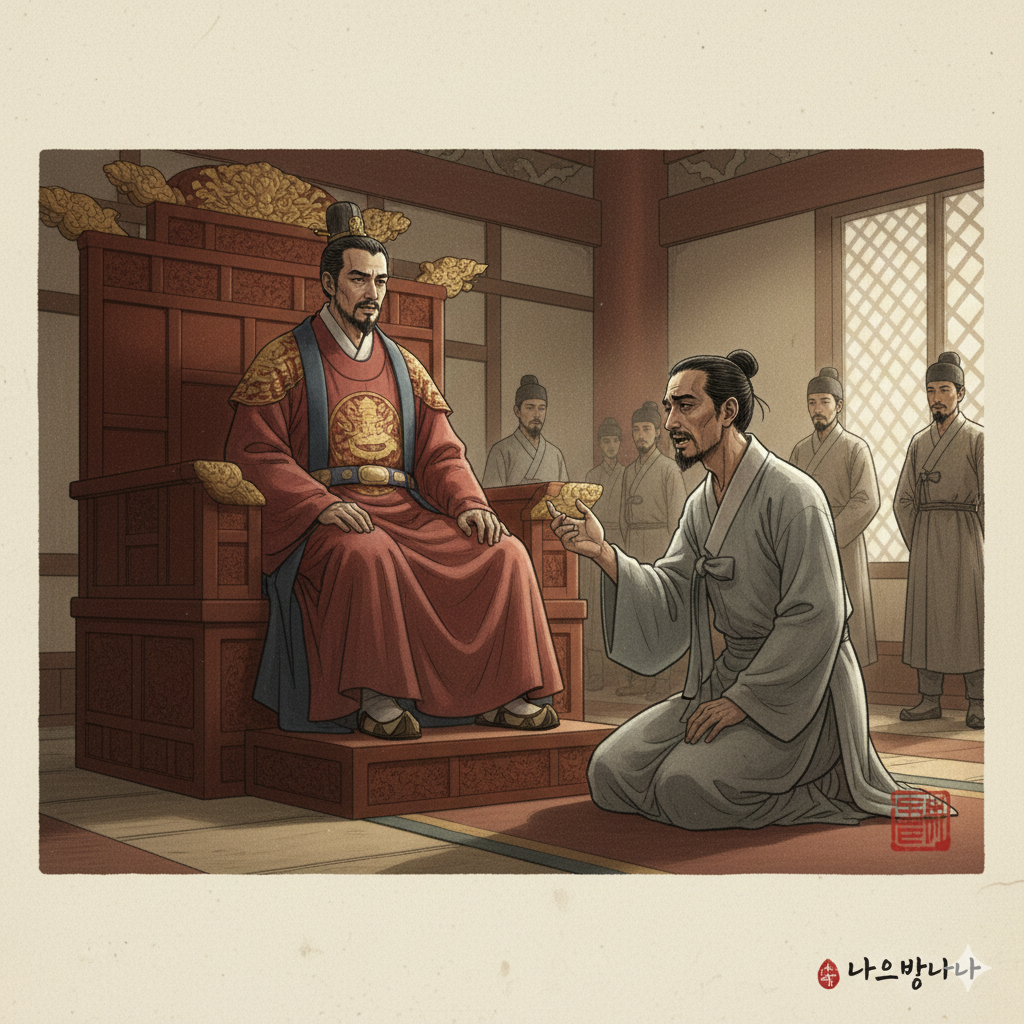 한국어 이미지 정보 (300자 내외): 왕궁 접견실, 위엄 있는 왕좌에 앉은 단정한 왕복의 범탈 왕이 흥미로운 표정으로 바라본다. 그 앞에 단정한 옷을 입은 바라문 선비가 강렬한 눈빛과 비장한 표정으로 왕에게 꿇어앉아 간절히 호소하고 있다. 그는 마치 심금을 울리는 웅변을 펼치는 듯하며, 배경에는 따뜻하고 부드러운 왕궁의 조명이 비친다. 나노바나나 스타일의 동양화풍으로 지혜와 절박함이 공존하는 감동적인 순간을 표현한다.