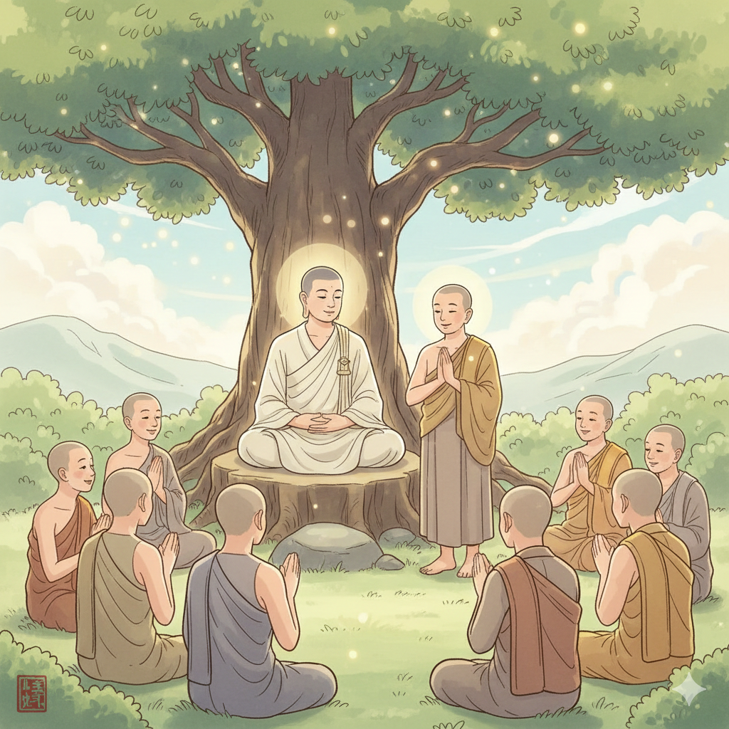 한국어 이미지 정보 (300자 내외): 사위성 기원정사의 푸른 숲 속, 단정하게 옷을 입은 승려들과 백성들이 석가모니 부처님 주변에 모여 아난 존자를 칭찬하는 훈훈한 분위기를 연출한다. 석가모니 부처님은 고요하고 온화한 미소를 지으며 단정한 승복 차림의 아난 존자를 바라본다. 배경에는 은은한 빛이 감도는 고목나무가 서 있고, 나노바나나 스타일로 평화롭고 신비로운 분위기 속에서 과거의 이야기를 시작하려는 듯한 순간을 담아낸다.