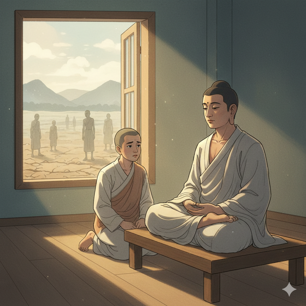 한국어 이미지 정보 (300자 내외): 고요한 기원정사 안에서 단정한 옷을 입은 석가모니 부처님이 평온한 모습으로 설법하고 계신다. 그의 시선은 멀리 창밖으로 향하고, 창밖 풍경에는 희미하게 기근으로 고통받는 백성들의 굶주린 모습이 그려져 있다. 단정한 승복 차림의 아난 존자는 부처님 옆에서 근심 가득한 표정으로 창밖을 응시하며 불안해하는 모습이다. 나노바나나 스타일로 고요함 속 불안감을 묘사하며, 배경에는 따뜻한 빛이 스며들어 희망을 놓지 않는 분위기를 더한다.