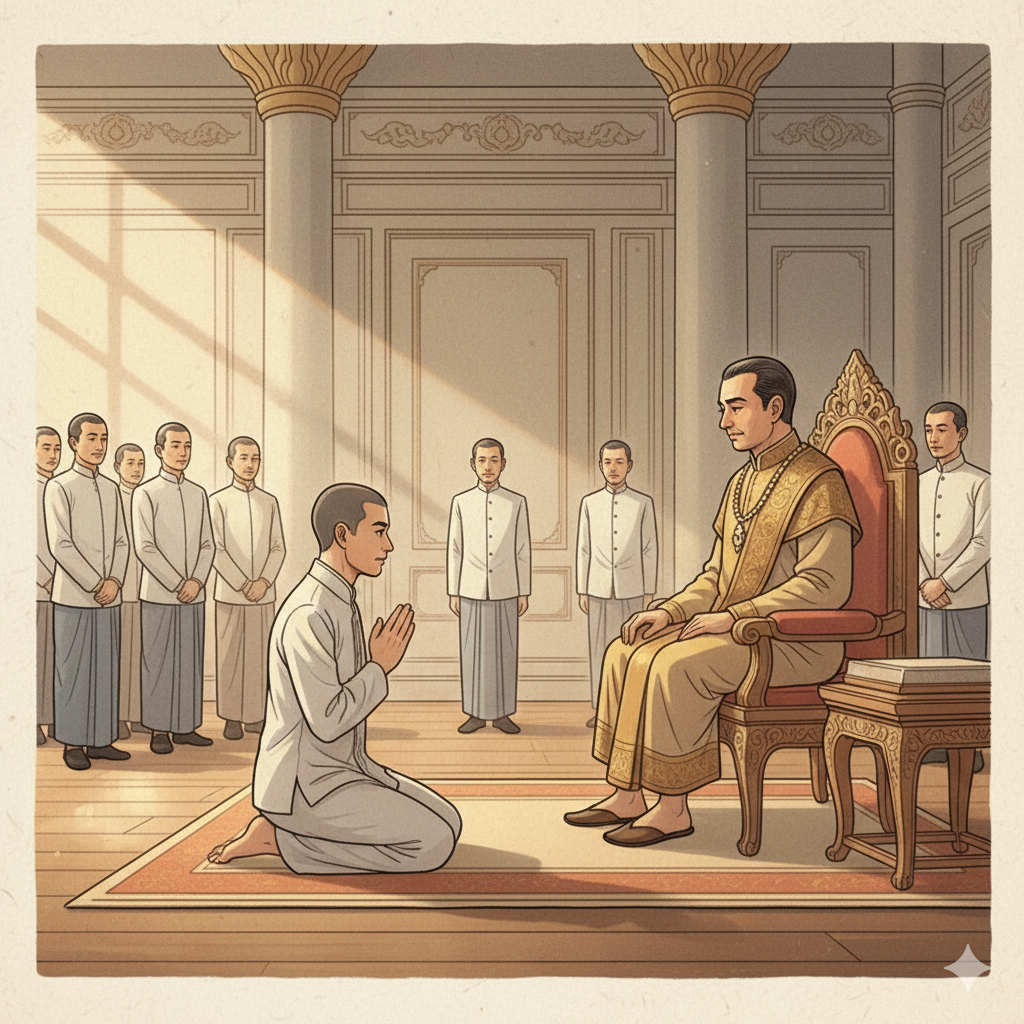 한국어 이미지 정보 (300자 내외): 왕궁의 웅장한 접견실에서 단정한 승복 차림의 아난 존자가 무릎을 꿇고 앉아 품위 있는 자세로 바세나디 왕에게 도움을 청하고 있다. 바세나디 왕은 화려하지만 정제된 왕복을 입고 근엄하면서도 자비로운 표정으로 아난의 이야기를 경청한다. 주변으로는 궁정 신하들이 단정한 의상으로 시립해 있으며, 나노바나나 스타일로 진지하면서도 희망적인 분위기를 연출한다. 실내에는 부드러운 빛이 스며들어 왕의 자비로움을 강조한다.