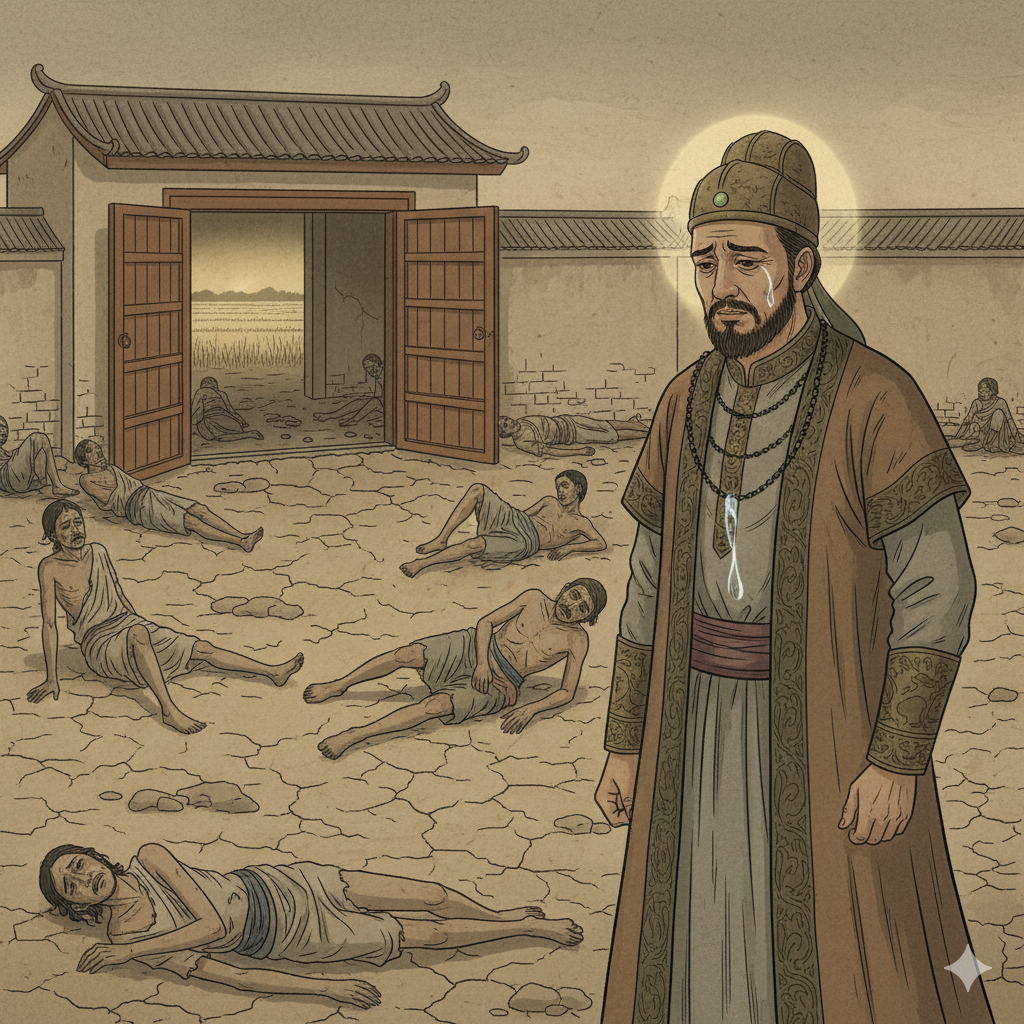 한국어 이미지 정보 (300자 내외): 가뭄으로 갈라진 황량한 땅과 메마른 들판이 보이는 왕궁 뜰에서, 단정한 왕복을 입은 범탈 왕이 수심 가득한 표정으로 굶주려 쓰러진 백성들을 바라보고 있다. 창고 문은 열려 있지만 안은 텅 비어 있고, 백성들은 남루한 옷차림으로 희미한 희망조차 없는 모습이다. 나노바나나 스타일로 비참하고 암울한 상황을 묘사하면서도, 왕의 고뇌와 책임감을 강조하는 동양화풍의 감성적인 콜라주를 그린다.