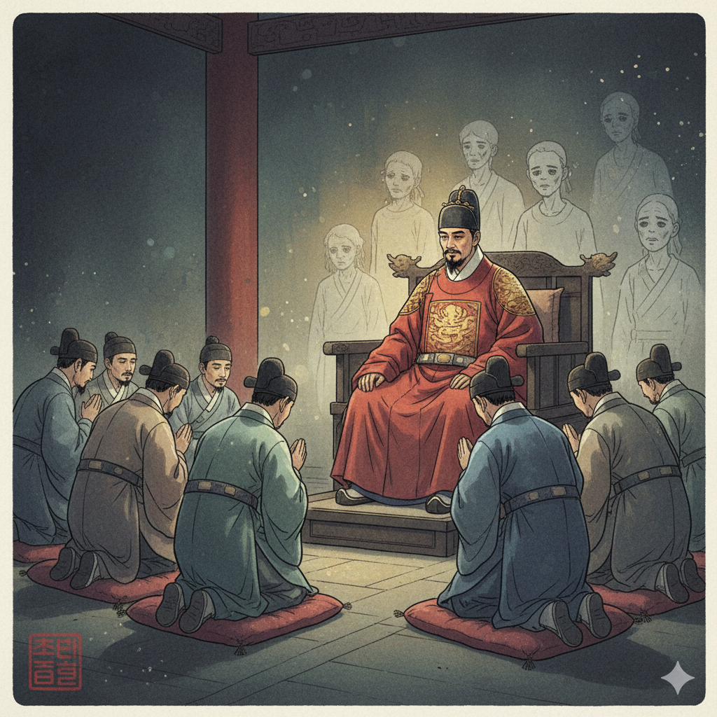 한국어 이미지 정보 (300자 내외): 왕궁의 어두운 회의실, 단정하고 위엄 있는 왕복을 입은 범탈 왕이 굳은 표정으로 앉아있다. 그 앞에는 단정한 관복을 입은 신하들이 조심스럽게 왕에게 보시 중단을 간언하며 겸손하게 무릎을 꿇고 있다. 왕의 등 뒤에는 희미하게 굶주린 백성들의 실루엣이 비쳐 비극적 상황을 암시한다. 나노바나나 스타일의 동양화풍으로 어둡지만 결연한 분위기 속에서 왕의 확고한 자비심과 결단을 표현한다.