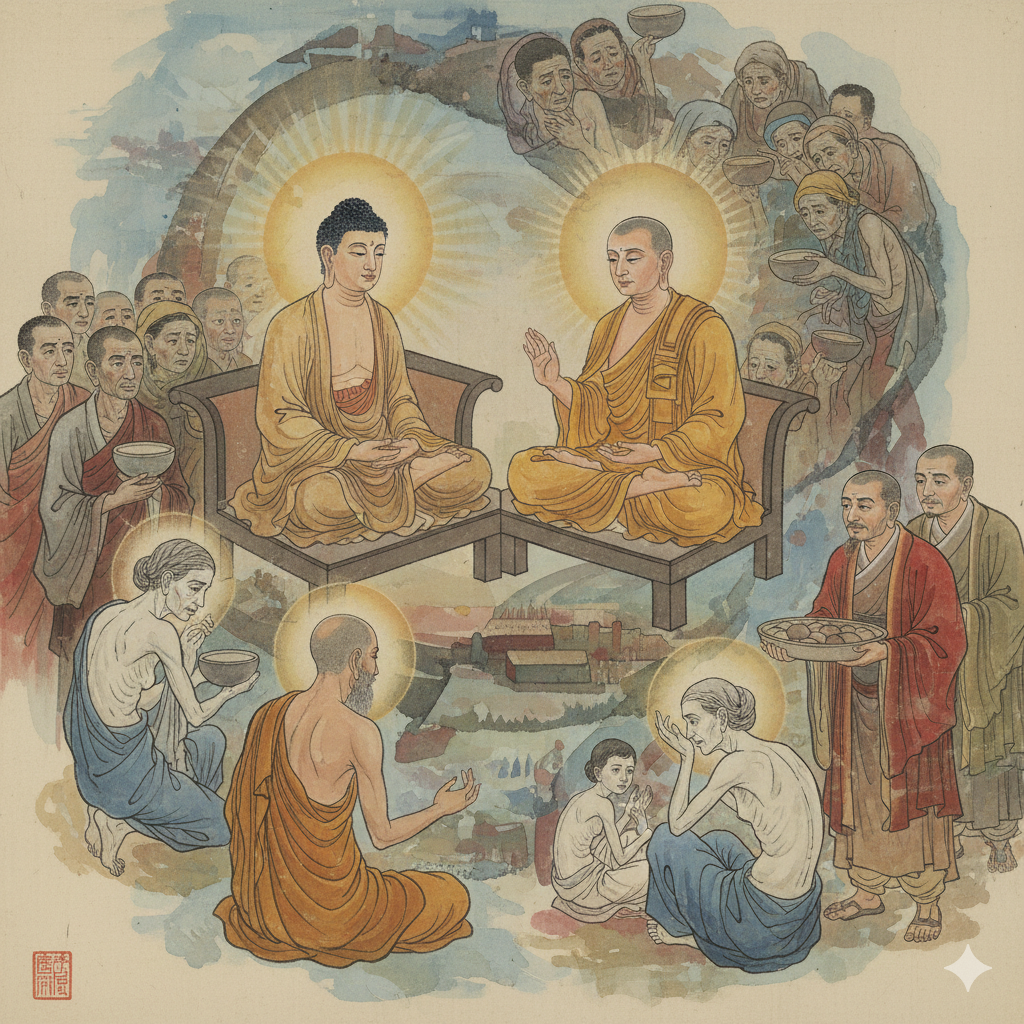 English Image Information (approx. 300 characters): In a serene hall, Siddhartha Buddha, clad in neat robes, delivers a sermon. Behind him, a blurred, ethereal collage in an East Asian painting style depicts scenes of famine-stricken people, a compassionate Brahmin scholar (Ananda's past life) assisting them, and King Brahmadatta generously giving alms. The imagery contrasts the emaciated figures with warm, helping hands and the dignified stance of the wise Brahmin. This Nanobanana-style illustration, with its warm, evocative colors, symbolically conveys the suffering and relief, emphasizing the spirit of compassion and sharing relevant to modern dilemmas.