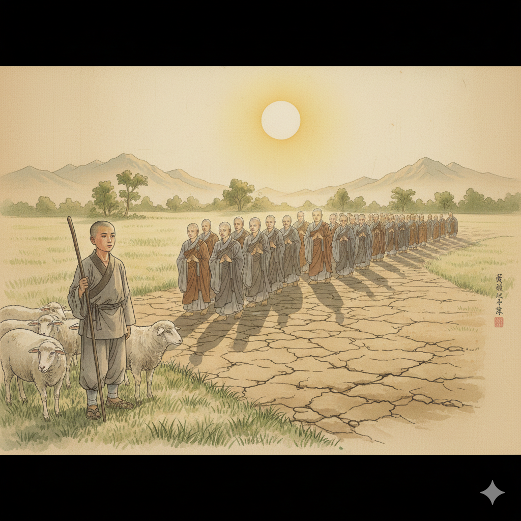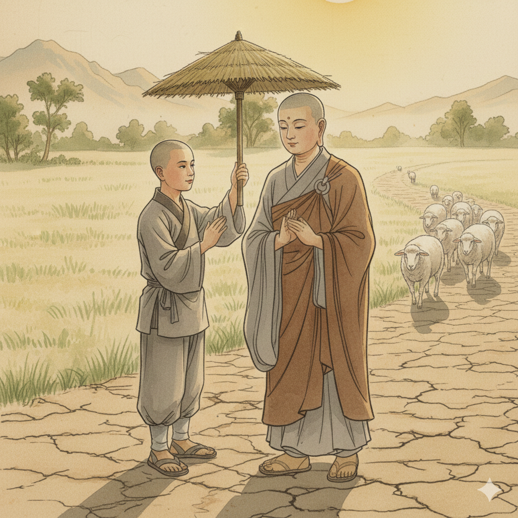 목동은 고민할 틈도 없었습니다. 그의 연민은 즉시 행동으로 옮겨졌습니다. 그는 길가에 무성하게 자란 평범한 풀들을 정성껏 그러모아 엮고 엮어 작은 **'임시 양산'**을 만들었습니다. 그 양산은 비록 보잘것없는 잡초로 만들어졌지만, 그 안에는 부처님을 향한 그의 모든 존경과 염려, 그리고 고통을 덜어드리고자 하는 순수한 자비심이 가득 담겨 있었습니다. 목동은 조심스럽게 다가가 그 양산으로 부처님의 머리 위를 가려드렸습니다. 그는 자신의 양 떼가 멀어져 가는 것도 잊은 채, 오직 부처님께 시원한 그늘을 드리고자 하는 마음 하나로 한참을 함께 걸었습니다. 그러나 문득 정신이 번쩍 들어 자신이 해야 할 본분을 깨닫자, 그는 조용히 양산을 부처님 곁에 내려놓고 양 떼를 찾아 허둥지둥 달려갔습니다.