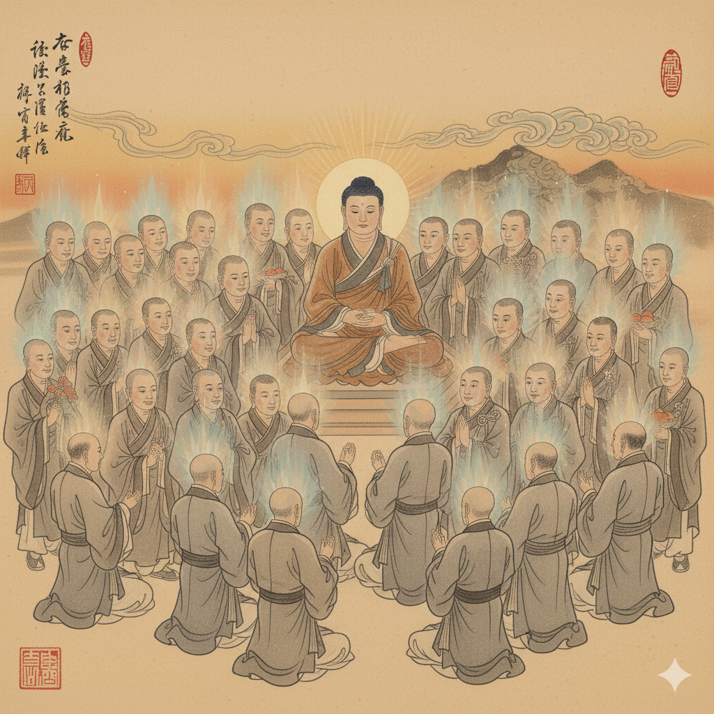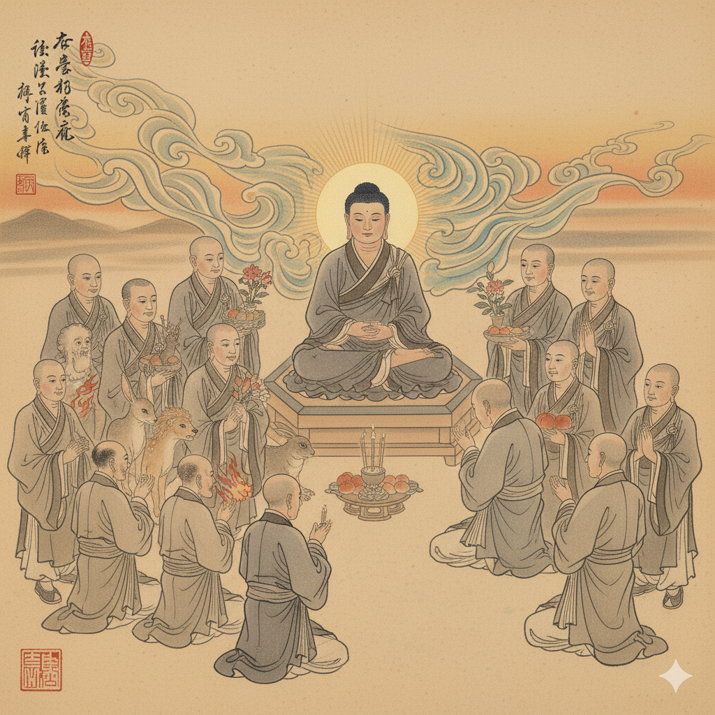 [English] Nano Banana AI Image Generation Prompt: Amidst radiant light, Buddha, dressed in neat monastic robes, sits serenely. Around him, various beings including humans, animals, and hungry ghosts, all adorned in simple yet proper attire, gather with peaceful expressions, offering fragrant flowers and venerating reverently. To his side, Ananda, in a respectful posture, approaches to ask Buddha a question, all depicted in a delicate East Asian art style. (299 characters)