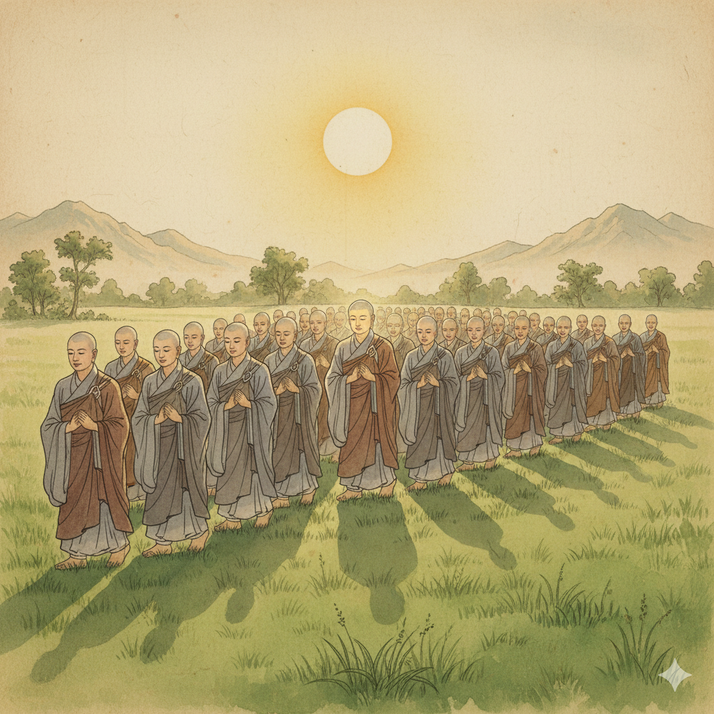 [English] Nano Banana AI Image Generation Prompt: On a verdant field under a blazing sun, Buddha, adorned in neat grey monastic robes, and his 1,250 monks walk peacefully. A subtle golden glow of compassion emanates from Buddha's face, softly illuminating the surroundings, evoking a sense of peaceful yet profound dignity. The scene is rendered with a quiet, mystical atmosphere, infused with an East Asian art style. (299 characters)