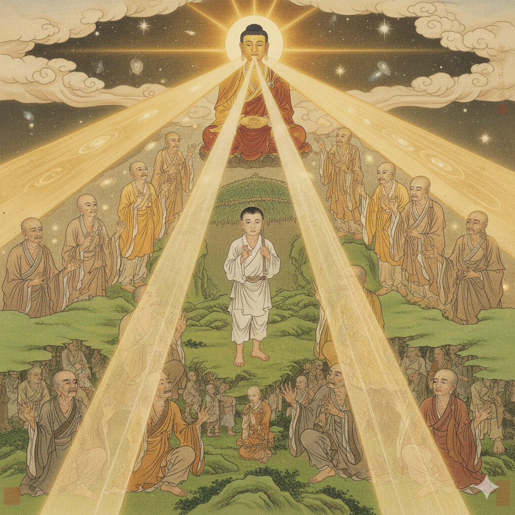 목동의 모든 행위를 조용히 지켜보시던 부처님께서는 그 순수한 마음에 온화한 미소를 지으셨습니다. 그 순간, 부처님의 입에서는 말로 다 표현할 수 없는 수십만 갈래의 밝고 영롱한 빛이 한꺼번에 뿜어져 나왔습니다. 그 빛줄기들은 단순히 공간을 채우는 것을 넘어, 셀 수 없을 만큼 많은 갈래로 퍼져나가 온 세상을, 심지어 신들이 사는 하늘 위부터 가장 깊고 어두운 지옥의 밑바닥까지도 두루 비췄습니다. 그 빛은 죄와 고통으로 얼룩진 존재들에게는 치유를, 혼돈에 빠진 이들에게는 진실을, 절망에 찬 영혼들에게는 희망을 선사하는 **'자비의 광명'**이었습니다. 부처님은 이 작은 선행이 우주적인 의미를 지님을 온몸으로 보여주셨습니다.