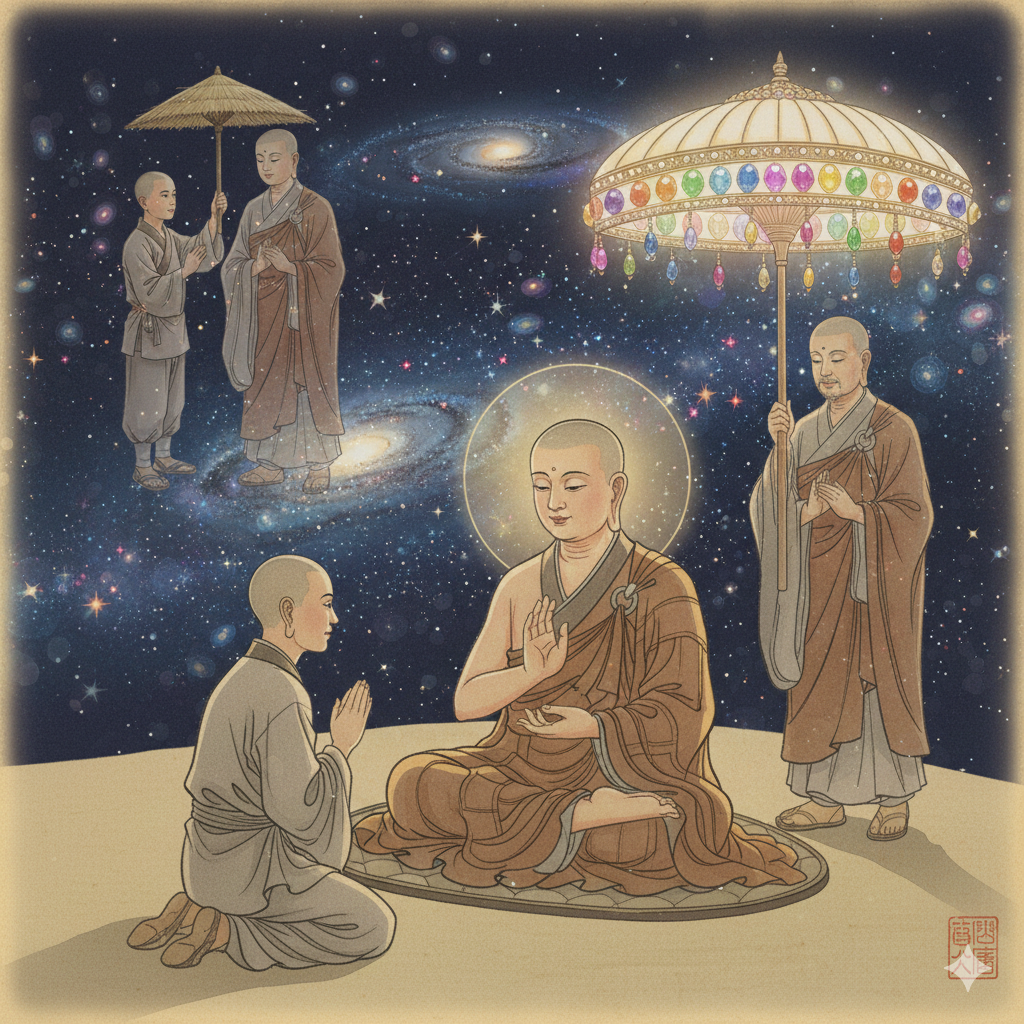 [English] Nano Banana AI Image Generation Prompt: Buddha, dressed in neat monastic robes, speaks with a benevolent smile to Ananda. Behind Buddha, in the vast cosmos, a collage in East Asian art style subtly shows the cleanly dressed shepherd holding a small grass parasol for Buddha, juxtaposed with his future self holding a magnificent parasol gleaming with seven jewels, brilliantly illustrating his prophecy. (299 characters)