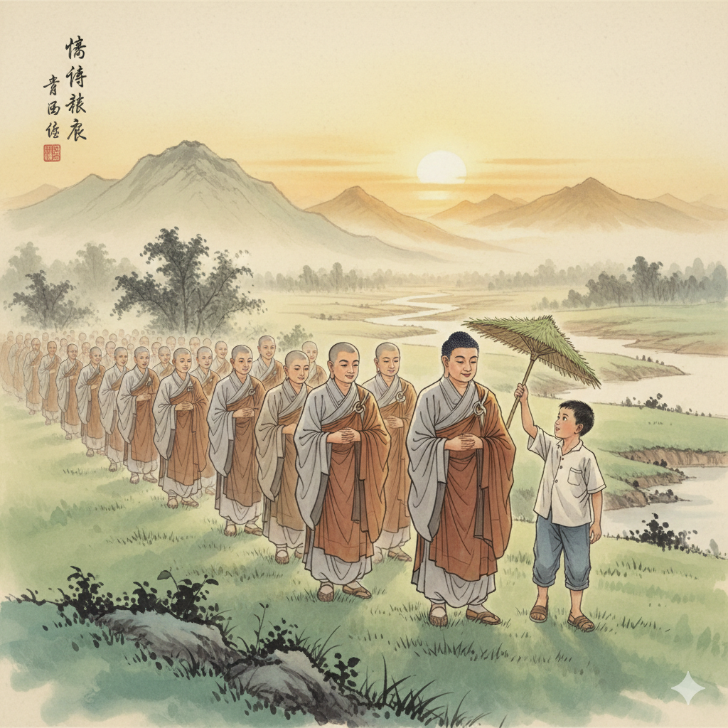 [Chinese] Nano Banana AI Image Generation Prompt: 烈日下,佛陀与一千二百五十名身着整洁僧袍的僧侣,平静地走在宁静的绿色田野上。旁边,一位穿着朴素的牧童,用青草精心制作的小伞遮挡着佛陀的脸庞,眼神中充满纯净的敬意。佛陀面带慈祥的微笑。背景以富有情感的东方画风描绘,强调了他们慈悲的旅程。 (288 characters)
