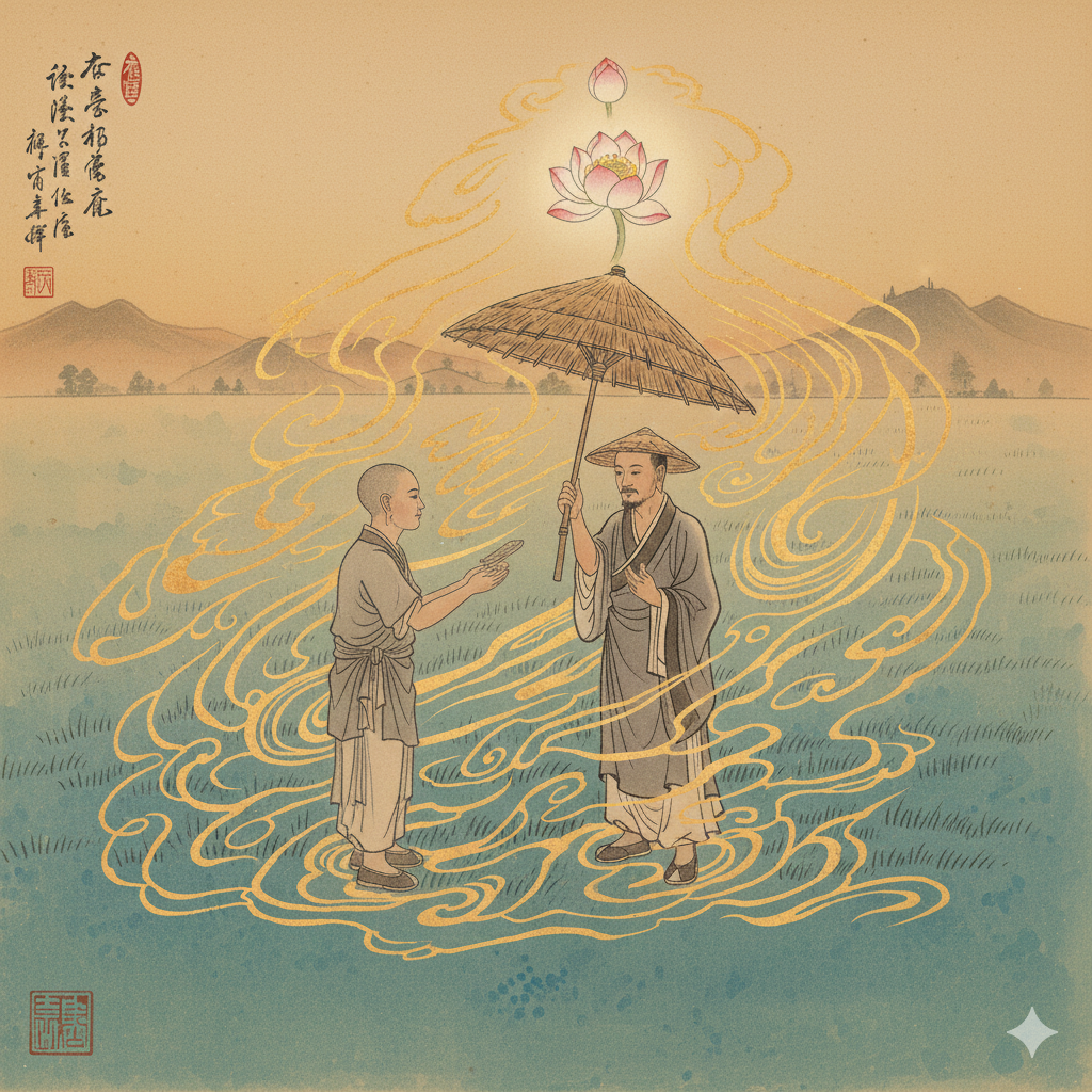 [English] Nano Banana AI Image Generation Prompt: On a sun-drenched, peaceful field, Buddha and his monks, dressed in neat robes, walk serenely. Beside them, a humble but clean-clad shepherd holds a grass parasol, respectfully offering it to Buddha with a bright smile. The shepherd's face reflects pure compassion and deep reverence, while Buddha radiates benevolent light with a gentle smile. The image conveys a bright, warm East Asian art style. (297 characters)