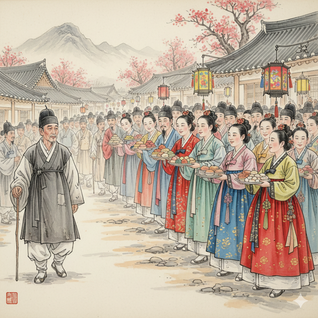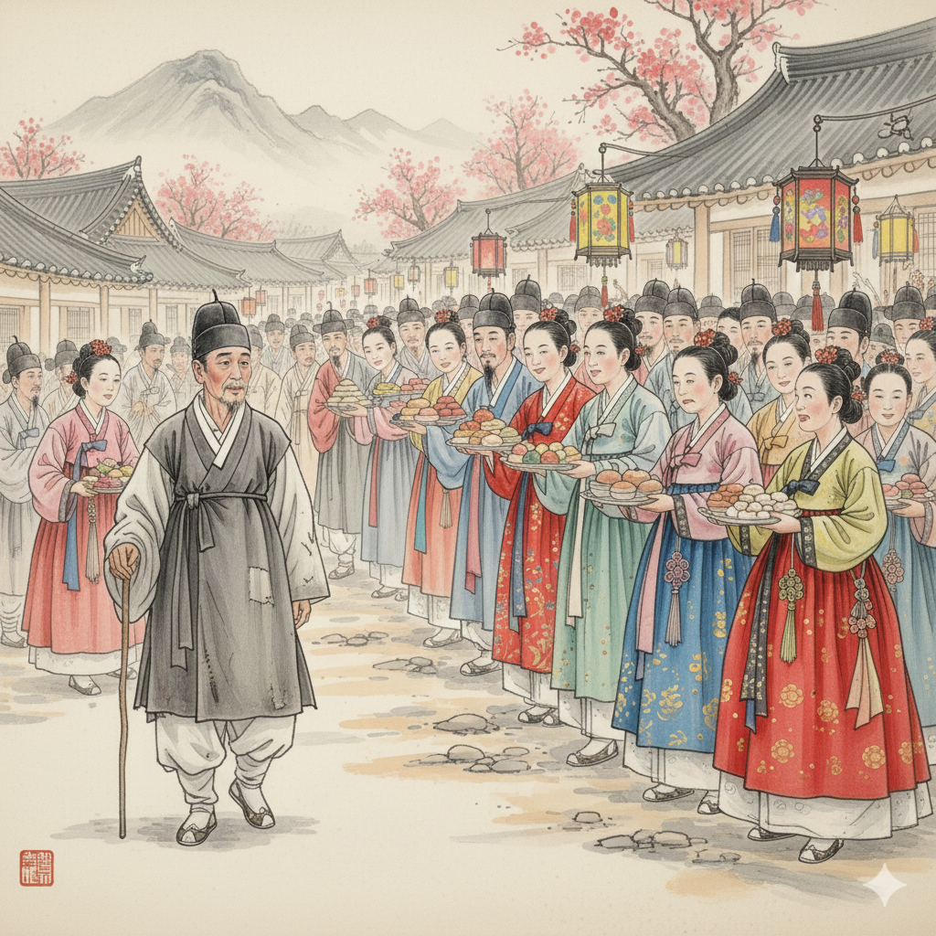 이미지 정보: 한국어 프롬프트: 화사한 동양화풍으로, 화려한 한복을 입은 친척들이 웃는 얼굴로 음식과 향을 들고 길가에 늘어서 쇼오카밧다를 환영하는 장면. 그 옆으로는 낡고 소박한 옷차림의 쇼오카밧다가 미묘한 표정으로 그들 사이에 섞여 들어가는 모습이 대비됩니다. 모두 단정한 복장으로 표현됩니다.