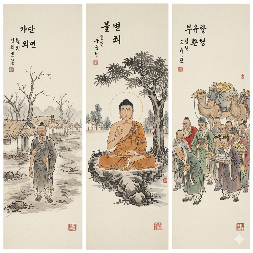 한국어 프롬프트: 동양화풍 콜라주 이미지로, 인간관계에서 물질의 허망함을 표현합니다. 중앙에는 평온하게 설법하는 석가모니 부처님이 자리하고, 그 주위로 가난할 때 외면당한 상인이 낡은 옷을 입고 고독하게 걷는 모습과, 부자가 되어 돌아오자 환영하는 친척들이 화려한 잔치와 낙타에 실린 재물을 에워싸는 장면이 교차됩니다. 모든 인물은 단정한 옷차림이며, 재물에 대한 사람들의 이중적인 태도와 변치 않는 진리의 대비를 강조합니다.