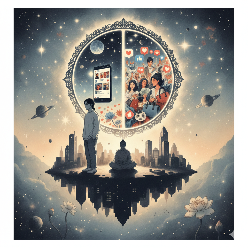 한국어 프롬프트: 환상적이고 따뜻한 동양화풍 콜라주. 고요한 우주 공간에 떠오른 현대 도시의 실루엣 위로, 거대한 거울이 반짝인다. 거울 한 면에는 낡은 옷을 입고 고독하게 서 있는 인물이 무심히 스마트폰 화면 속 화려한 SNS 이미지를 응시하고 있고, 다른 면에는 화려한 옷을 입은 사람들이 돈다발과 명품 가방을 들고 '좋아요'와 박수갈채를 보내는 모습이 비친다. 이 모든 것을 멀리서 바라보는 한 명상하는 인물의 실루엣은 초연한 미소를 띠고 있다. 모든 인물은 단정하고 현대적인 옷을 입고 있다.