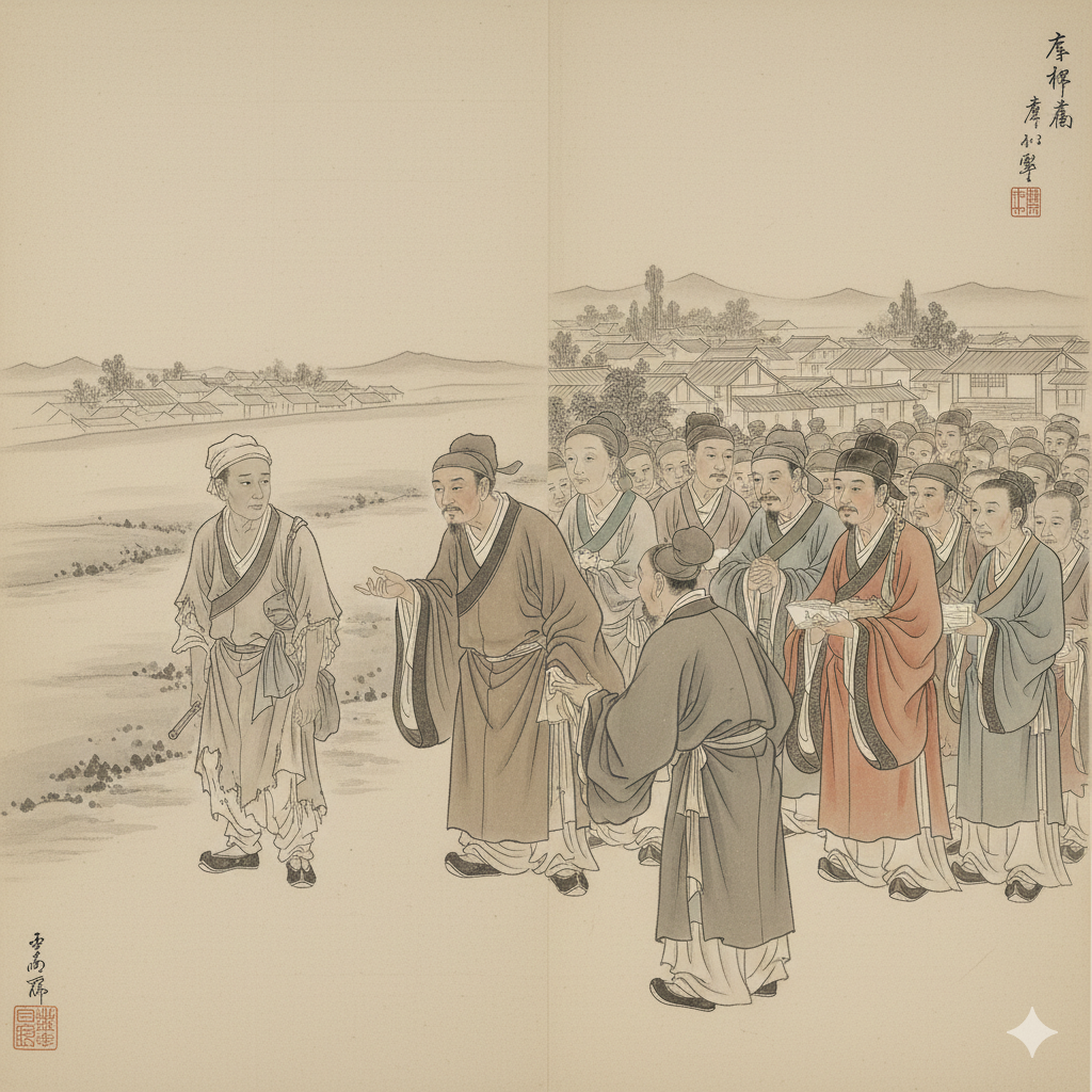 - "그의 귀향 소식이 전해지자, 친척과 지인들은 태도를 싹 바꾸었다. 음식과 향을 준비하여 환영 잔치까지 차리고, 도중까지 나가서 그를 맞이하려 했다."