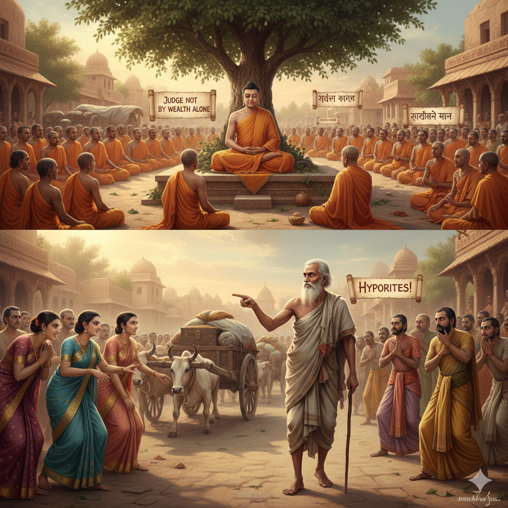우리에게 주는 교훈: 이 설화는 우리에게 사람의 진정한 가치는 재물이나 사회적 지위에 있지 않다는 것을 명확히 일깨워줍니다. 물질적인 조건에 따라 태도를 바꾸는 인간의 이중적이고 허영적인 모습을 통해, 진정성 있는 인간관계의 소중함과 모든 존재를 존중하는 마음의 중요성을 강조합니다. 나아가 우리가 세상을 어떤 눈으로 바라보고 타인을 어떻게 대해야 하는지에 대한 근본적인 질문을 던지며, 탐욕을 경계하고 내면의 지혜를 추구해야 한다는 불교적 가르침을 전달합니다.