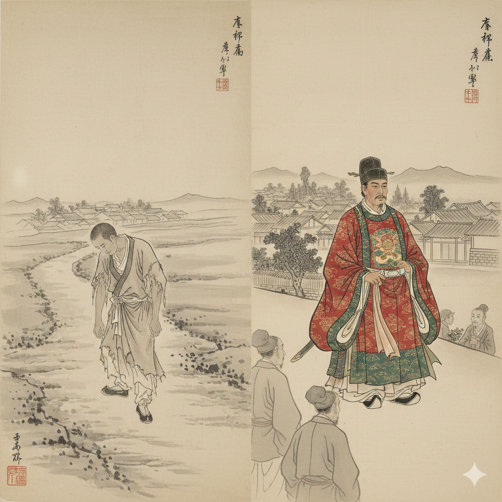 이미지 정보: 한국어 프롬프트: 동양화풍으로, 가난한 시절의 쇼오카밧다가 낡은 옷을 입고 고개를 숙인 채 홀로 황량한 길을 걷는 모습과, 먼 타지에서 부자가 되어 비단 옷을 입고 돌아오는 당당한 모습이 콜라주 된 장면. 배경에는 고향 마을이 멀리 보이며, 친척들이 그를 외면하는 듯한 그림자가 희미하게 표현됩니다. 모든 인물은 단정하게 묘사됩니다.