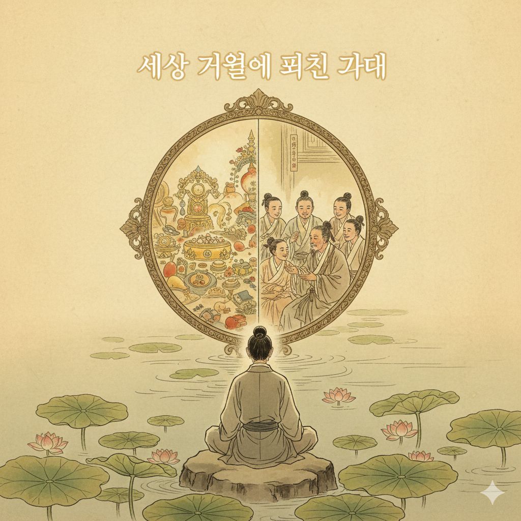 이미지 생성 정보: 한국어 프롬프트: 고요한 동양화풍으로, 빛나는 황금 동전들이 쌓여있는 거대한 탑 앞에서 고뇌하는 사람들의 실루엣과, 그 너머 밝고 소박한 초가집 마당에서 환하게 웃으며 서로 손을 잡은 가족들의 모습이 대비되는 콜라주. 중앙에는 이 모든 것을 감싸 안듯 은은하게 빛나는 지혜로운 눈빛이 자리하고 있다. 모든 인물은 단정하고 한국적인 옷을 입고 있다.