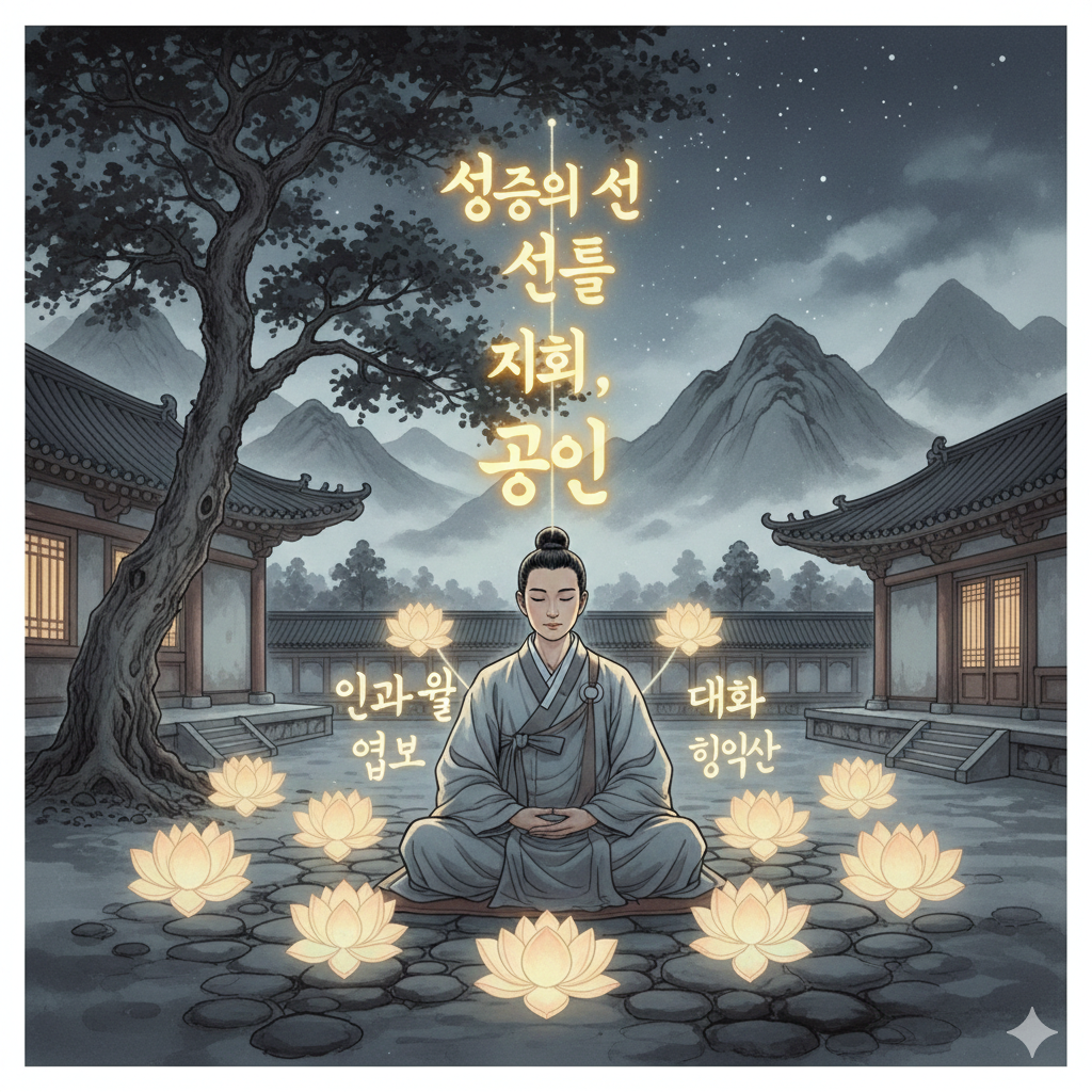 - Korean (300자 내외): 고요한 동양화풍의 산사 마당. 단정한 옷을 입은 인물이 좌선하며 명상하고 있다. 그의 주변에 '인과율', '업보', '대화', '상생', '홍익인간'이라는 한글 단어들이 연꽃처럼 피어나는 빛으로 나타난다. 인물의 머리 위로는 '성장의 선물', '지혜', '공인'이라는 핵심 글귀가 찬란하게 빛나며 그의 내면과 연결된다. 구글 나노 바나나 스타일.