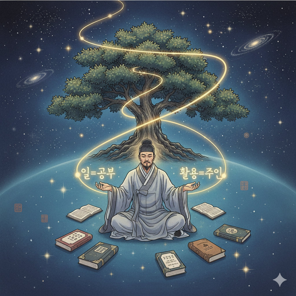 철학/종교/불교 요소 및 핵심 글귀 이미지 생성 정보 (한글): 고요한 우주 공간에 떠 있는 지혜의 나무 아래, 단정하고 지혜로운 학자(혹은 수행자)가 명상하고 있다. 그의 주변에는 고대 동서양의 철학 서적(예: 논어, 칸트 철학서), 불경(예: 법구경), 성경(Bible) 등이 함께 놓여있다. 학자의 손에서는 '일=공부', '활용=주인'이라는 핵심 글귀가 빛나는 문장으로 솟아나며, 이 글귀는 나무와 우주 전체로 퍼져나가 인류의 의식 성장을 이끄는 빛의 나침반처럼 빛난다. 평화롭고 고귀한 분위기가 압도적이다. 철학/종교/불교 요소 및 핵심 글귀 이미지 생성 정보 (English): Under a radiant tree of wisdom in a serene cosmic space, a neatly dressed and wise scholar (or practitioner) meditates. Around him are ancient Eastern and Western philosophy books (e.g., Analects, Kant's philosophy), Buddhist scriptures (e.g., Dhammapada), and Bibles. From the scholar's hands, the core message 'Work=Study' and 'Utilization=Master' emerges as shining text, radiating into the tree and cosmos, guiding humanity's consciousness like a luminous compass. An atmosphere of peace and nobility is paramount.