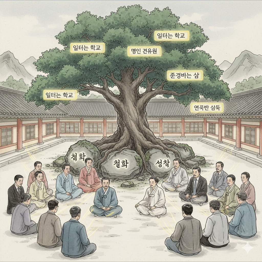 - English: A serene and spiritual East Asian style temple courtyard with a towering, vibrant tree of life at its center. Its roots are firmly anchored by stones inscribed with Korean words like 'Philosophy', 'Wisdom', and 'Reflection'. The branches bear glowing leaves inscribed with 'Workplace is School', 'Master Researcher', and 'Life of Respect'. Beneath the tree, neatly dressed people of various ages and professions are meditating quietly or engaging in wise conversations. Warm, bright 'Gi-un' (energy) gently emanates around them. This sentimental East Asian collage depicts a harmonious scene where philosophical depth, religious spirituality, and practical life lessons intertwine. (Approx. 160 words)