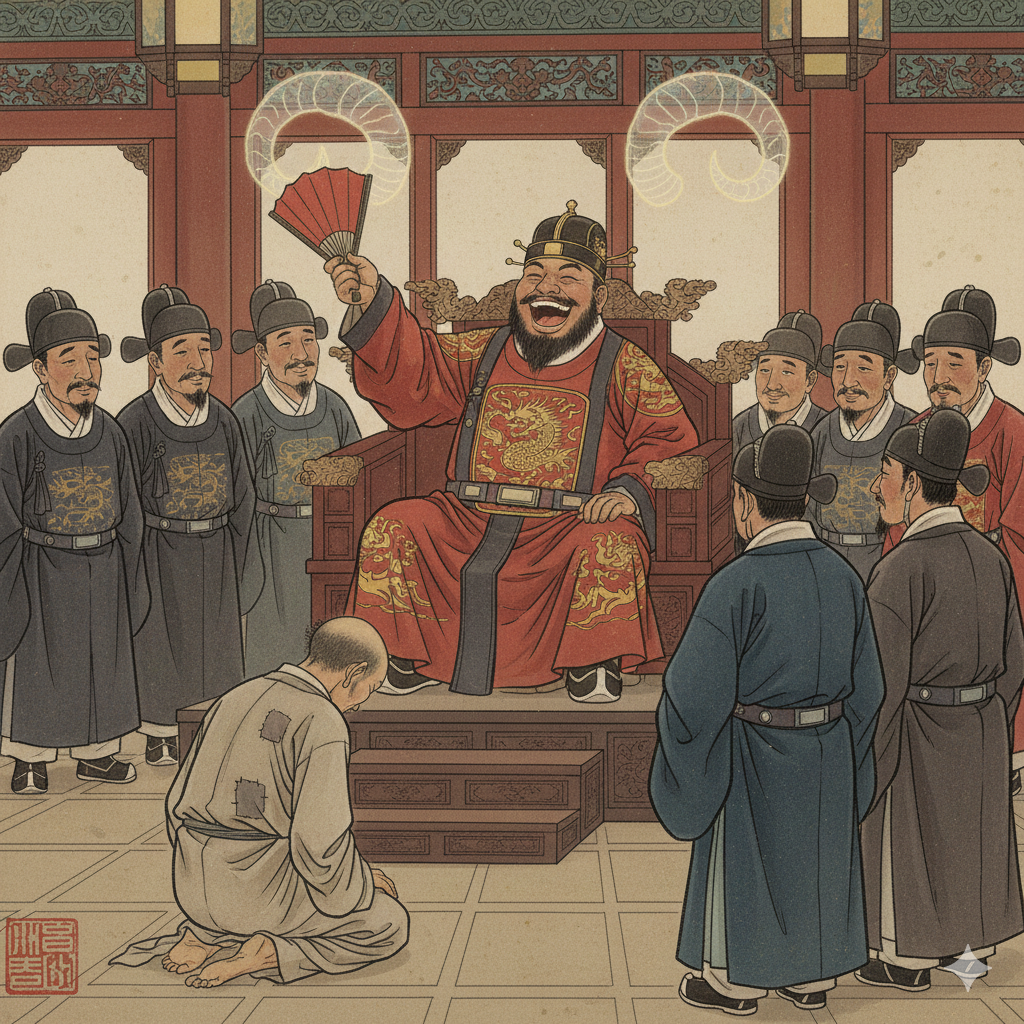 - 이미지 생성 프롬프트 (Google Nano Banana 스타일): Korean: 궁궐 법정에서 왕이 크게 웃고 있다. 단정한 복식의 신하들은 억지로 미소를 띠거나 눈치 보는 표정. 가난한 남자는 여전히 무릎 꿇은 채 고개를 숙이고 있다. 왕의 뒤쪽으로 양의 뿔이 은은하게 비치고, 주변에는 왕이 칼은 없다고 손짓하며 일축하는 모습. 코믹하면서도 풍자적인 동양화풍. 모든 인물은 단정하게 옷을 입고 있다. English: In the palace courtroom, the king laughs heartily. Neatly dressed courtiers force smiles or exchange knowing glances. The poor man remains kneeling, head bowed. Behind the king, faint ram horns glow. The king dismisses the idea of such a sword with a wave of his hand. A humorous, satirical Eastern painting style. All figures are neatly dressed.