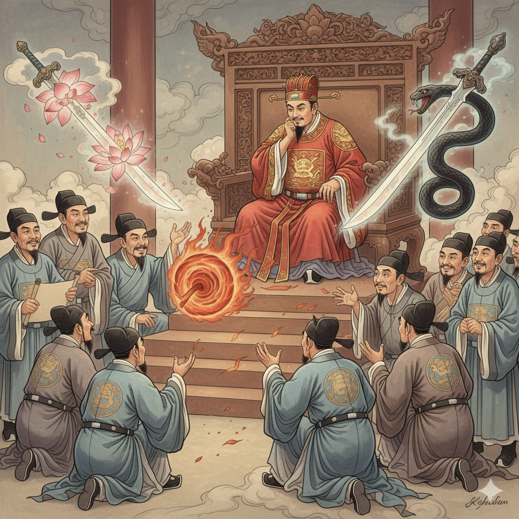 - 이미지 생성 프롬프트 (Google Nano Banana 스타일): Korean: 새롭게 즉위한 왕이 옥좌에 앉아 있고, 그 앞에서 단정한 옷을 입은 여러 신하들이 각양각색의 칼 모양을 묘사한다. 한쪽에는 연꽃처럼 아름다운 칼, 다른 쪽에는 붉은 불덩이 칼, 또 다른 쪽에는 구불구불한 뱀처럼 생긴 칼의 형상이 환영처럼 떠다닌다. 모두 제각각 상상의 칼을 묘사하는 혼란스러운 모습. 동양화풍으로 과장되고 풍자적인 분위기. 모든 인물은 단정하게 옷을 입고 있다. English: A newly enthroned king sits on his throne, as several neatly dressed courtiers describe various sword shapes before him. Illusory images float: a sword like a beautiful lotus, a fiery red one, another shaped like a coiling snake. A chaotic scene of everyone describing imaginary swords. An exaggerated and satirical Eastern painting style. All figures are neatly dressed.