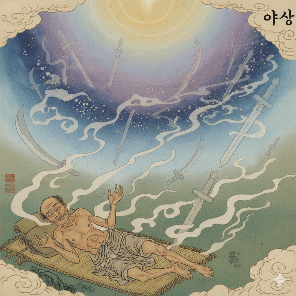 - 이미지 생성 프롬프트 (Google Nano Banana 스타일): Korean: 어둡고 낡은 방, 한 남자가 초라한 옷차림으로 잠꼬대를 하며 "칼, 칼" 외치고 있다. 남자의 꿈속에는 화려하게 빛나는 칼 '정명도'가 아른거린다. 칼은 만져본 적도 없지만, 그의 얼굴엔 깊은 열망과 집착이 어리고, 주변은 칼 모양의 희미한 잔상들로 가득하다. 동양화풍으로 인물의 고뇌와 몽환적인 집착을 표현. 모든 인물은 단정하게 옷을 입고 있다. English: In a dark, old room, a man in humble clothes mutters "sword, sword" in his sleep. In his dream, the dazzling sword 'Jeongmyeongdo' shimmers. Though he has never touched it, his face shows deep longing and obsession, and the surroundings are filled with faint, sword-shaped afterimages. An Eastern painting style depicts the character's anguish and dreamlike obsession. All figures are neatly dressed.