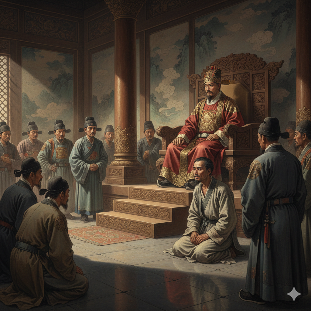 - 이미지 생성 프롬프트 (Google Nano Banana 스타일): Korean: 웅장한 궁궐 법정, 단정한 옷을 입은 위엄 있는 왕과 그 앞에 무릎 꿇고 앉은 초라한 가난한 남자. 주변에는 신하들이 호기심 가득한 표정으로 서 있다. 왕은 엄중하게 질문하고, 남자는 초조하지만 진실을 말하는 표정. 조명은 왕에게서 남자에게로 비추며 긴장감을 조성. 동양화풍의 사실적 묘사. 모든 인물은 단정하게 옷을 입고 있다. English: A grand palace courtroom, with a majestic king in neat attire seated before a humble poor man kneeling. Courtiers stand around with curious expressions. The king questions sternly, and the man speaks nervously but truthfully. Lighting from the king highlights the man, creating tension. Realistic Eastern painting style. All figures are neatly dressed.