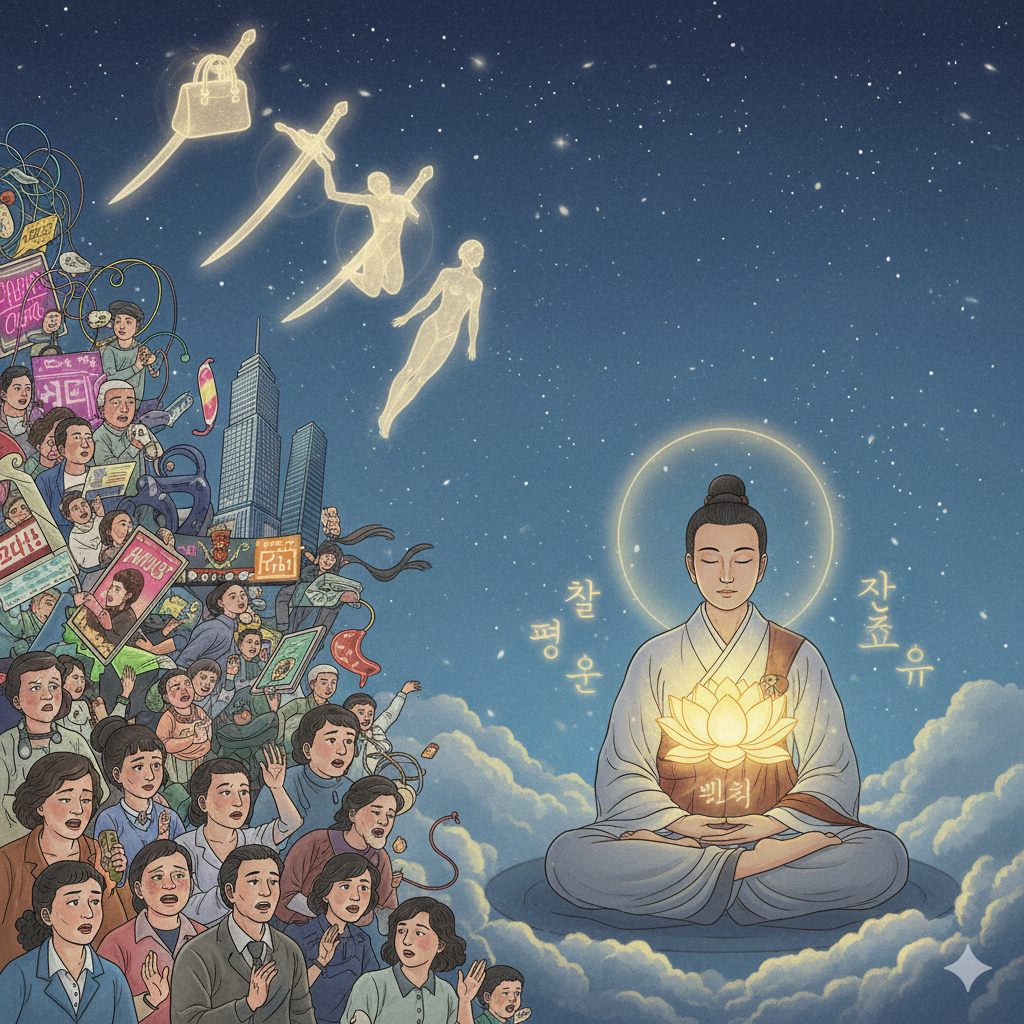 Korean: 고요한 동양화풍의 우주 공간을 배경으로, 혼돈과 빛이 조화롭게 어우러진 콜라주 이미지를 표현한다. 화면 왼쪽에는 복잡하게 얽힌 소셜 미디어 피드, 번쩍이는 광고판, 그리고 타인의 시선에 갇힌 듯 불안한 표정의 현대인들이 뒤섞여 있다. 이들의 머리 위로는 '정명도'를 상징하는 칼 형상(명품 가방, 성공을 상징하는 건물, 완벽한 몸매 등)이 끝없이 변형되어 나타난다. 그러나 화면 오른쪽으로 갈수록 혼란은 잦아들고, 단정한 옷을 입은 한 인물이 고요히 명상하는 모습이 나타난다. 그의 가슴에서는 순수하고 강렬한 황금빛 연꽃 '불성'이 피어나 우주를 밝히고, 이 빛은 모든 외부의 허상들을 부드럽게 지워나간다. 인물 주변에는 '성찰', '평온', '자유'라는 한글 단어가 아련하게 떠오른다. 모든 인물은 단정한 옷을 입고 있다. English: Depict a collage image in a serene East Asian painting style, set against a cosmic background where chaos and light harmonize. On the left side of the frame, a chaotic mix of complex social media feeds, flashing billboards, and anxious modern individuals trapped by others' gazes. Above their heads, various mutating forms of 'Jeongmyeongdo' (e.g., luxury bags, iconic buildings symbolizing success, perfect bodies) continuously appear. However, moving towards the right side of the frame, the chaos subsides, revealing a neatly dressed individual meditating peacefully. From their chest, a pure and intense golden lotus, 'Buddha-nature,' blooms and illuminates the cosmos, gently erasing all external illusions. Korean words like 'Reflection,' 'Serenity,' and 'Freedom' faintly emerge around the figure. All individuals are neatly dressed.