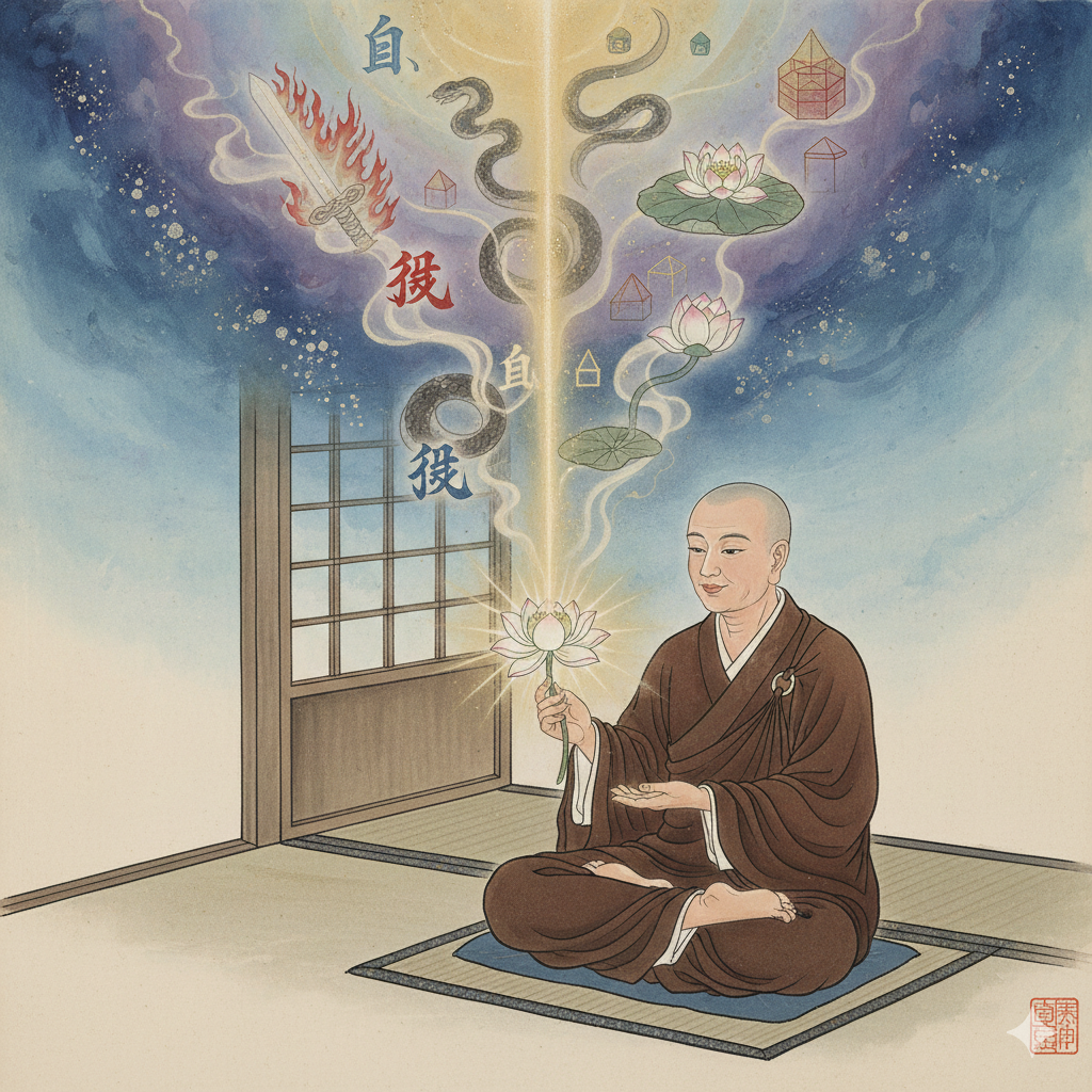 - 이미지 생성 프롬프트 (Google Nano Banana 스타일): Korean: 고요하고 신비로운 동양화풍의 우주 공간. 중앙에 단정한 옷을 입은 승려가 좌선하고 있으며, 그의 몸에서 순수하고 밝은 황금빛 연꽃이 피어나 마치 오라처럼 주변을 감싸고 있다. 이 연꽃은 무한한 지혜와 자비를 상징한다. 배경에는 이전에 나왔던 '칼'의 잔상들이 희미하게 흩어지며 연꽃의 빛 속으로 녹아드는 모습. 영적이고 고요한 분위기. English: A tranquil and mystical cosmic space in an Eastern painting style. At the center, a neatly dressed monk meditates, and a pure, bright golden lotus blossoms from his body, enveloping him like an aura. This lotus symbolizes infinite wisdom and compassion. In the background, faint remnants of the 'sword' images dissipate and melt into the light of the lotus. A spiritual and serene atmosphere.